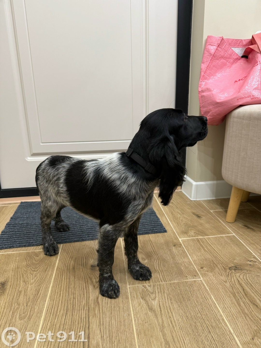 Черный с белым спаниель, щенок, девочка, с чёрным пластиковым ошейником