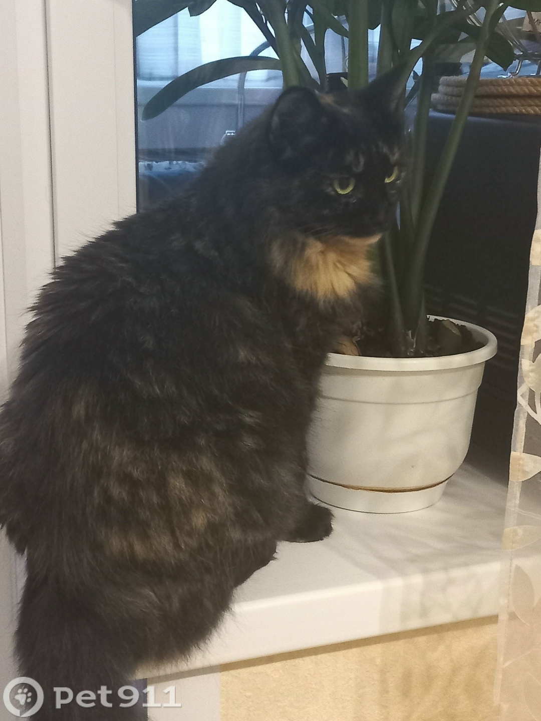 Окрас черно-рыжий, прибилась к бездомным котам, очень ласковая, умная, игривая, здоровая. Ей, примерно, год. Ходит в латок.