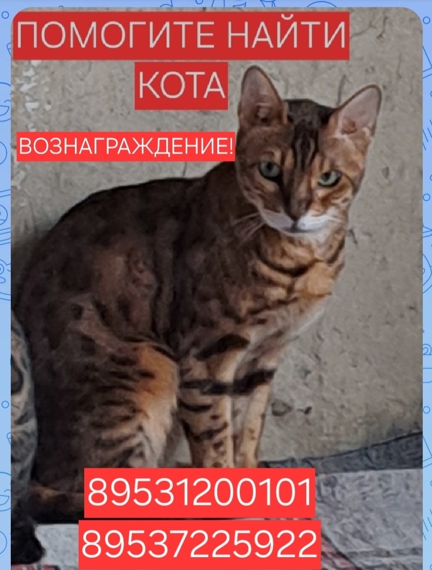 Потерялся кот в на улице Садовая ( ищем в районе МЖК/ДИНАМО) бенгал тощий высокий трусливый, скорее всего далеко не уйдет, будем ждать любую информацию!