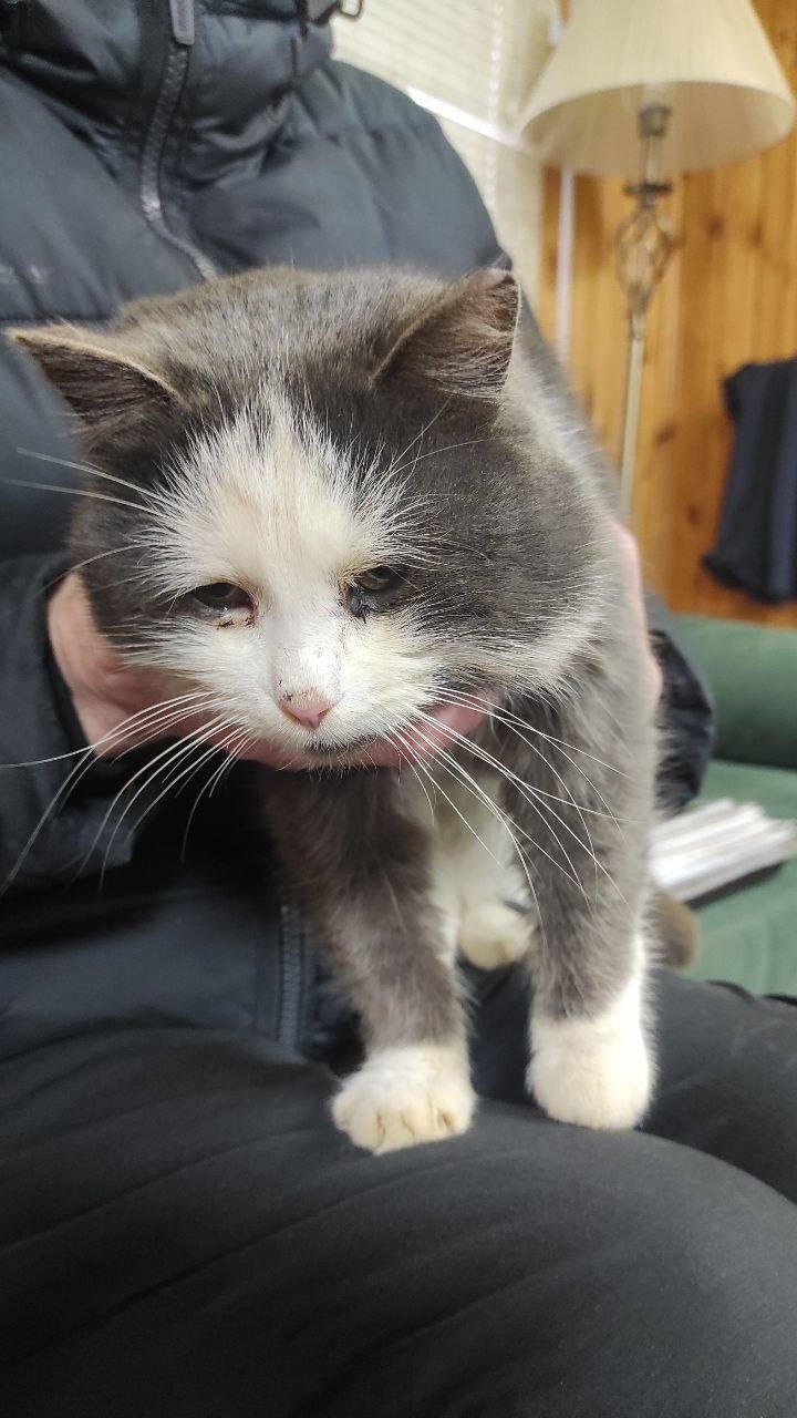 Вчера прибился новый кот, явно респироторка и нуждается в лечении, ребята сказали,что очень ласковый, запустили в вагончик, чтобы сфотографировать.