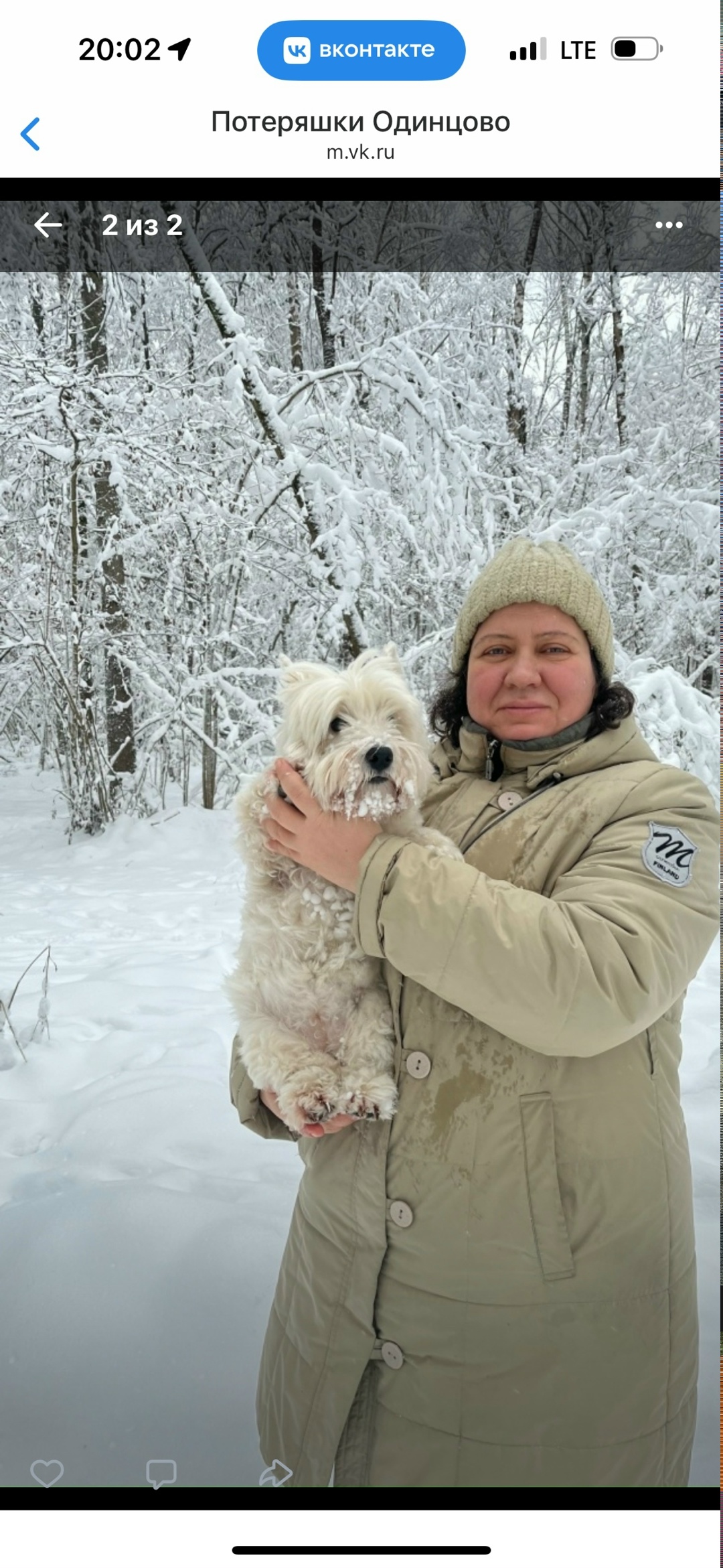 Потерялась собака Вест Хайленд 5 лет. В 19.00 сегодня у гребневскоц церкви, светящийся ошейник без адресника контакт Женя 9163702123