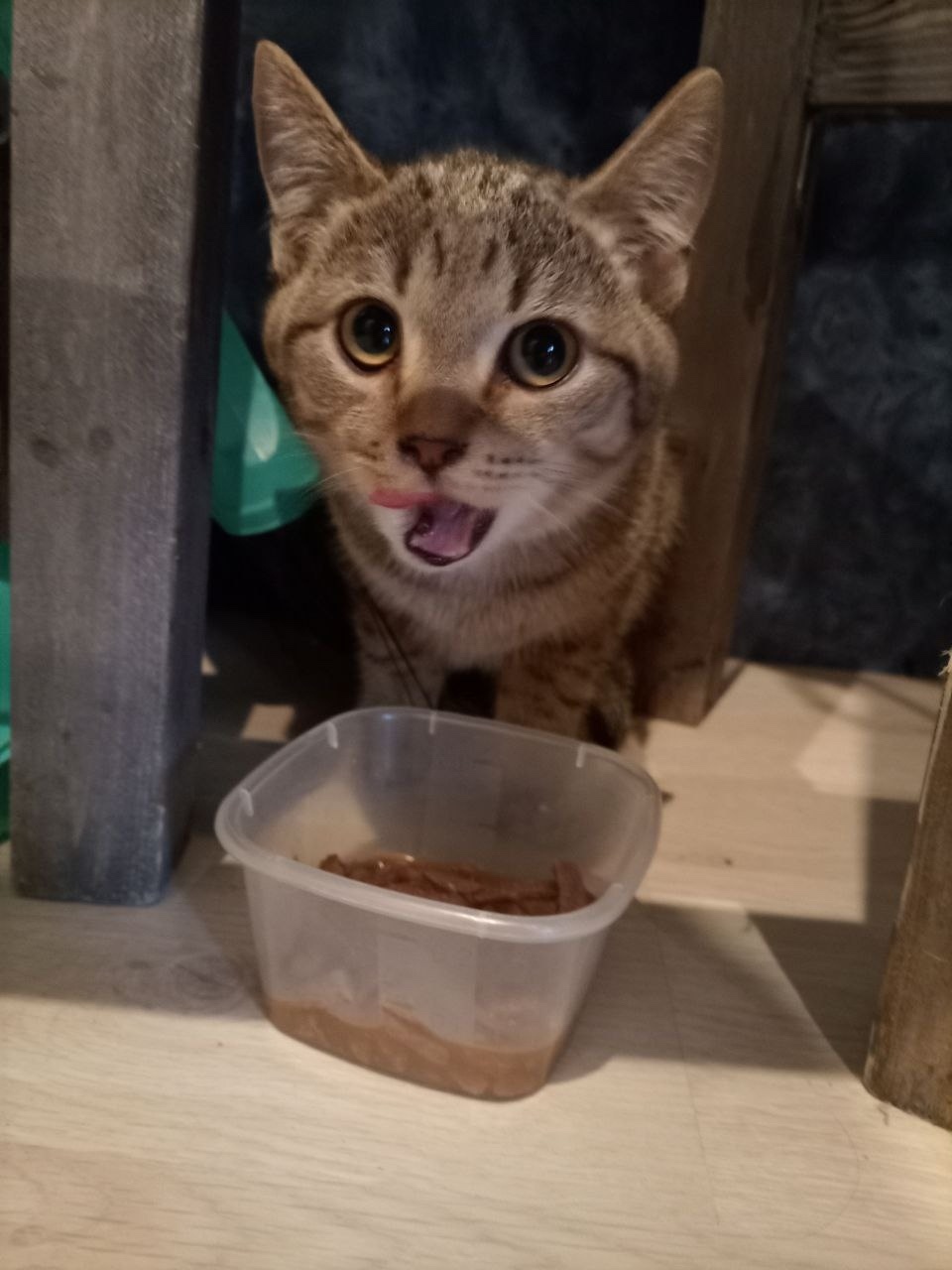 Малыш очень чистый, ласковый, явно домашний. Окрас классический полосатый («шпротный»), очень выразительные глаза. На вид 2-3 месяца.