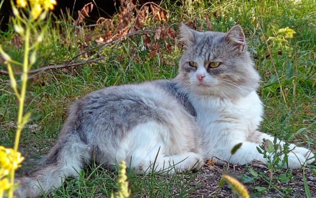· Внешность: Некрупный, пушистый. На двух передних лапах есть рыжие пятна.