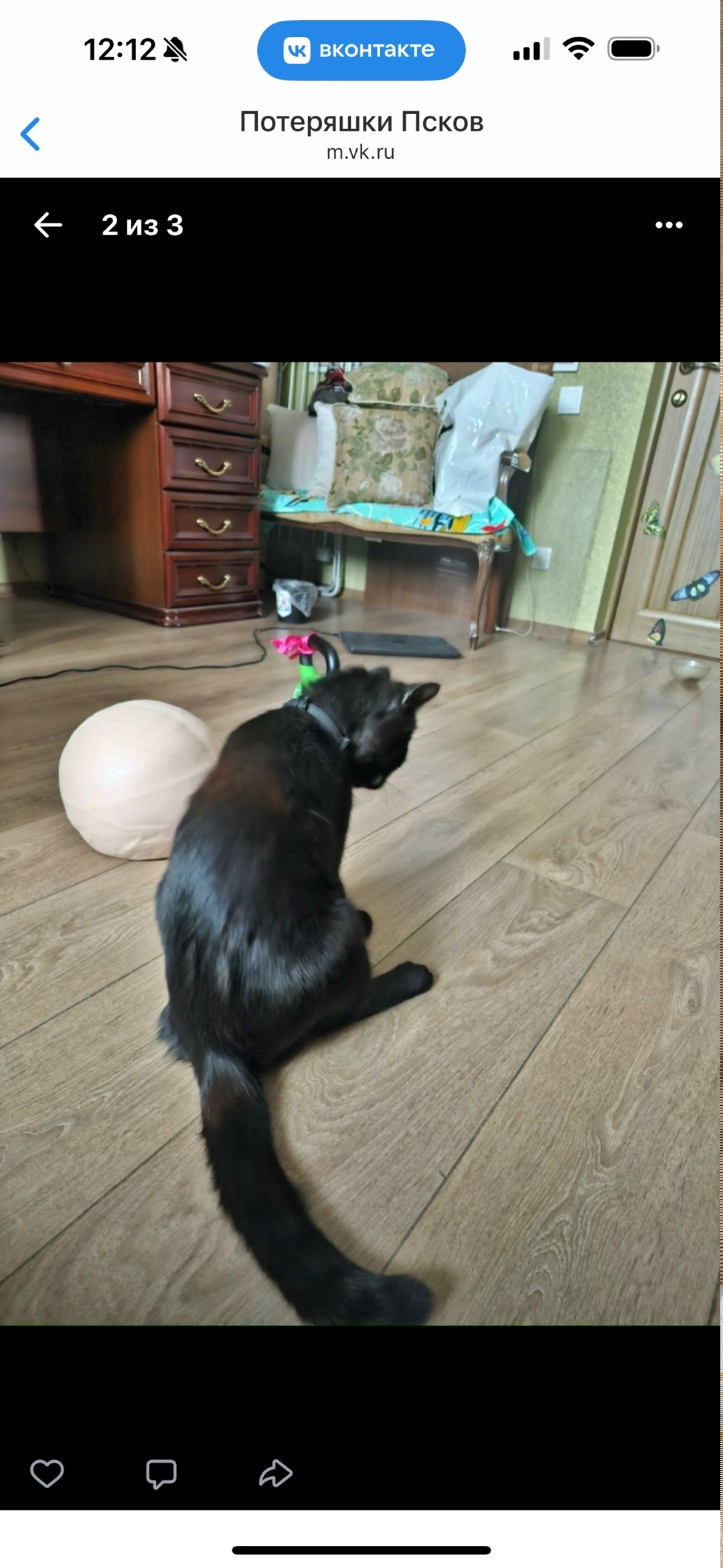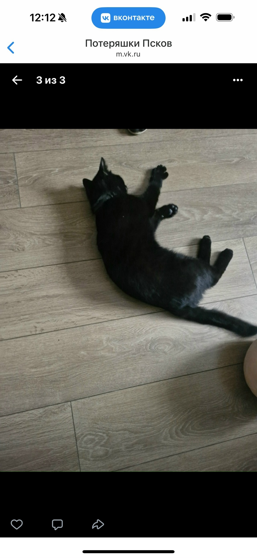 У дома номер 10 по ул. Комдива Кирсанова найден молодой чёрный кот с ошейником. Он уже несколько дней бегает по двору, раньше здесь не появлялся. При ходьбе высоко задирает передние лапы, есть явные проблемы с координацией (возможно, последствия перенесённой травмы или болезни). Владельцев прошу связаться со мной через личные сообщения