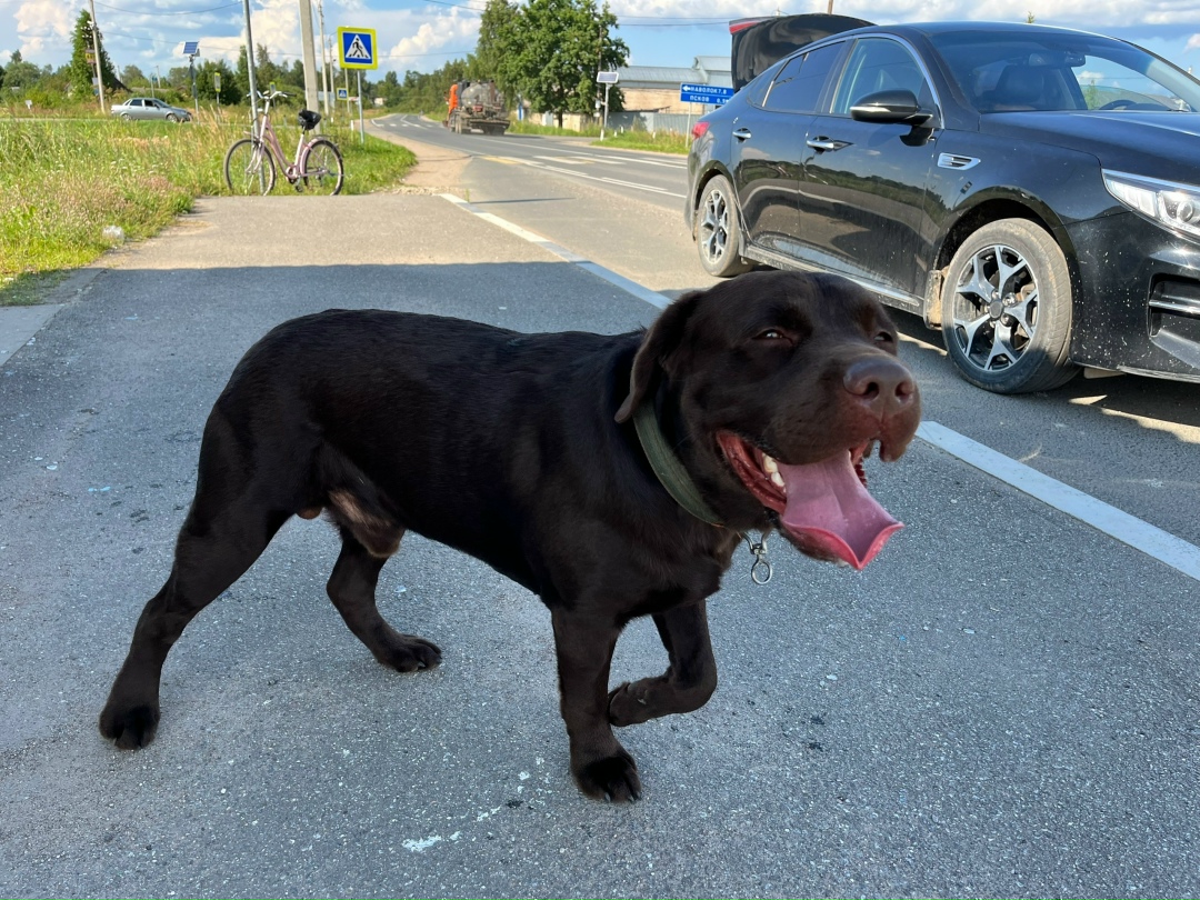 Чей-то потеряшка. Кобель, коричневого цвета, молодой, похож на помесь лабрадора, контактный. Тканевый зеленый ошейник с карабином, возможно убежал. Бегает в районе Россетей в д. Родина.