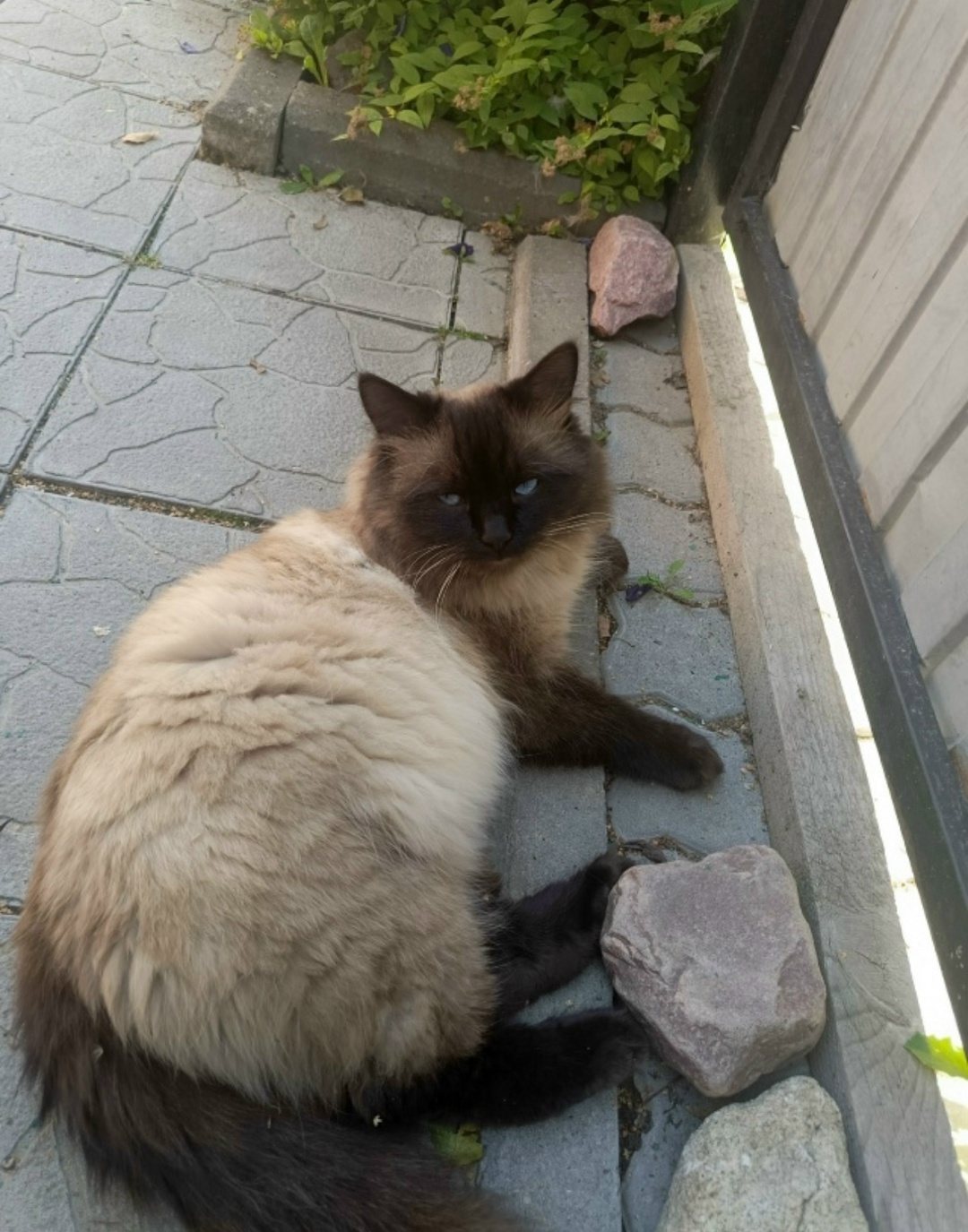По телосложению крупный, сиамского окраса с голубыми глазами.