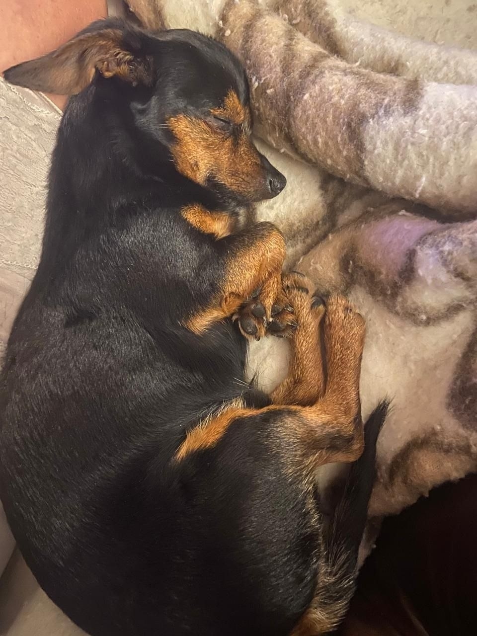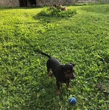 Очень маленькая собака, черно-подпалый, с сединой на мордочке, громко лает