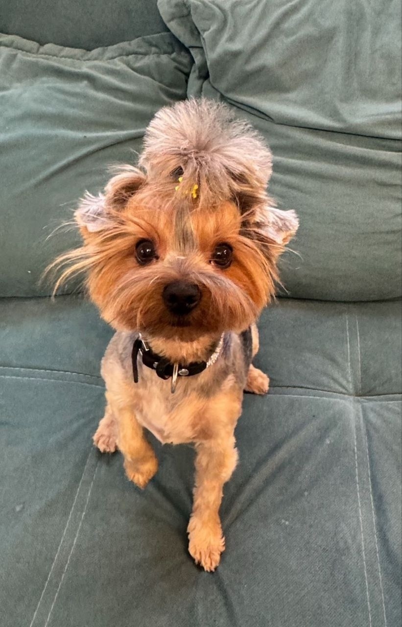 21.08. Кличка Фенди, окрас серый с рыжими подпалинами, пострижена, в коричневом ошейнике со стразами.