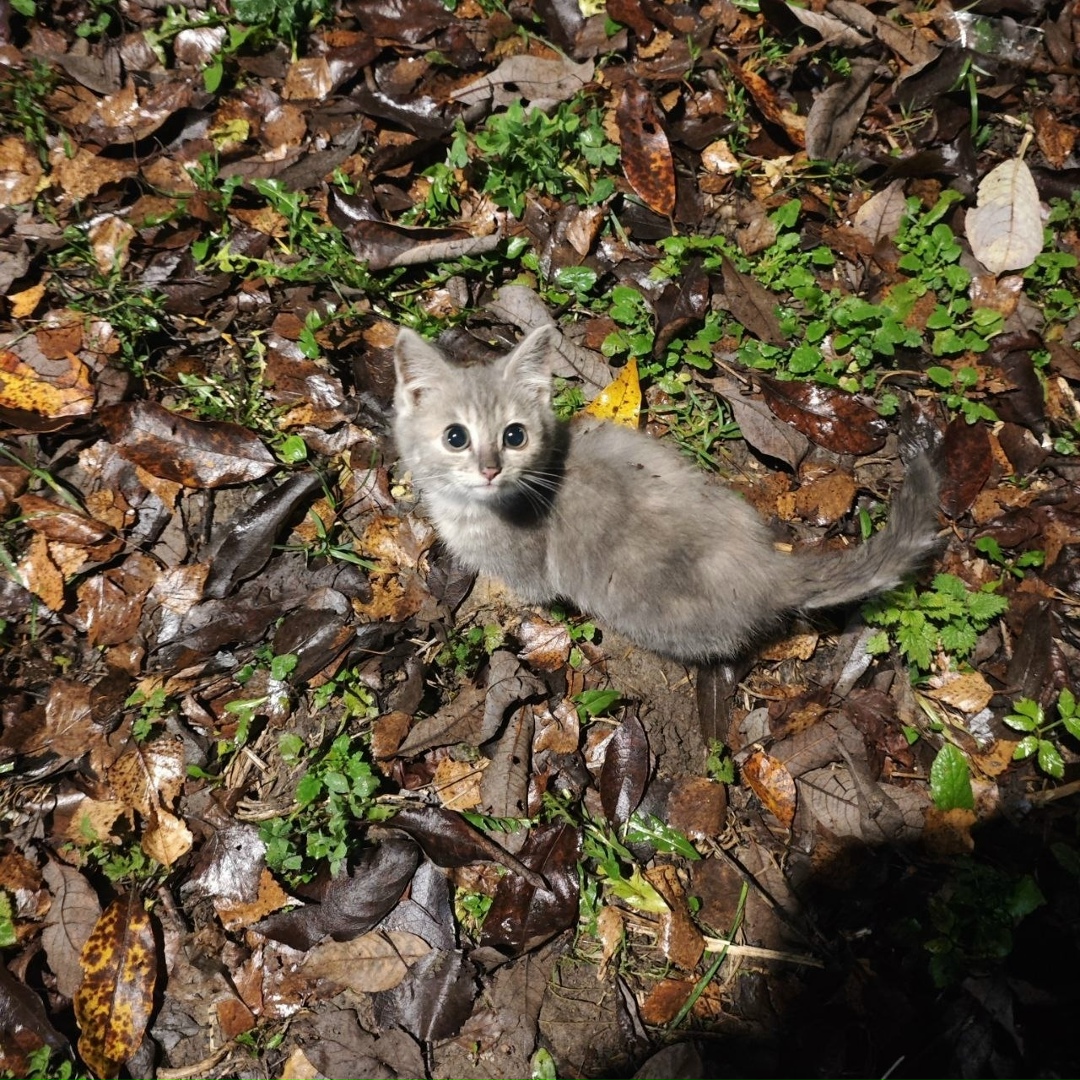 Искали свою кошку, наткнулись на такое чудо. Сзади дома прячется и громко мяукает. К сожалению взять не можем, дома кот после операции.