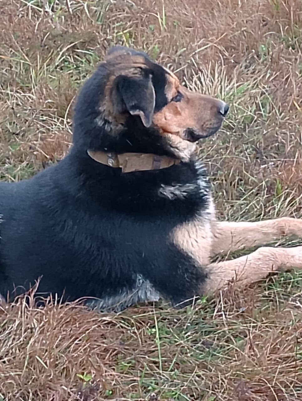 испугался салютов. зовут Рэй. рост выше колен, спина и бока чёрные живот и лапы светло рыжие. на груди светлая полоса в виде галочки. уши висячие. убежал без ошейника.