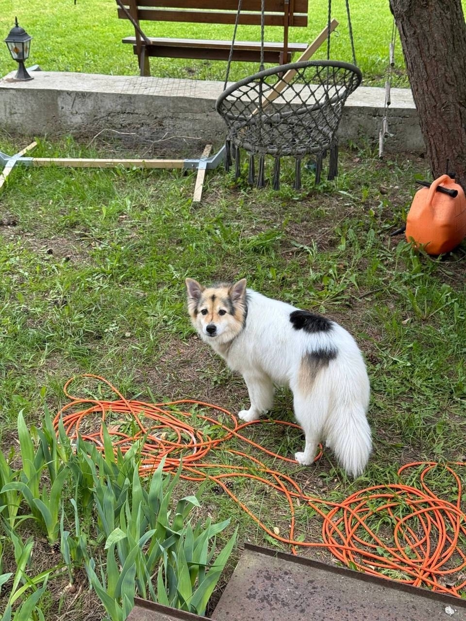 Собака Альма, девочка. Без ошейника. Приблизительный возраст 10 лет. Окрас белый, с рыжей мордочкой и черными пятнами на теле. Не агрессивная, не кусается. Довольно пугливая, недоверчивая.