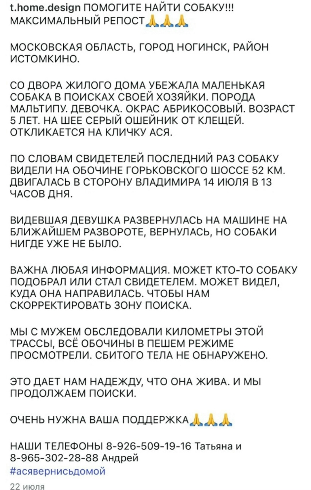 ВАЖНА ЛЮБАЯ ИНФОРМАЦИЯ. МОЖЕТ КТО-ТО СОБАКУ ПОДОБРАЛ ИЛИ СТАЛ СВИДЕТЕЛЕМ. МОЖЕТ ВИДЕЛ, КУДА ОНА НАПРАВИЛАСЬ. ЧТОБЫ НАМ СКОРРЕКТИРОВАТЬ ЗОНУ ПОИСКА.