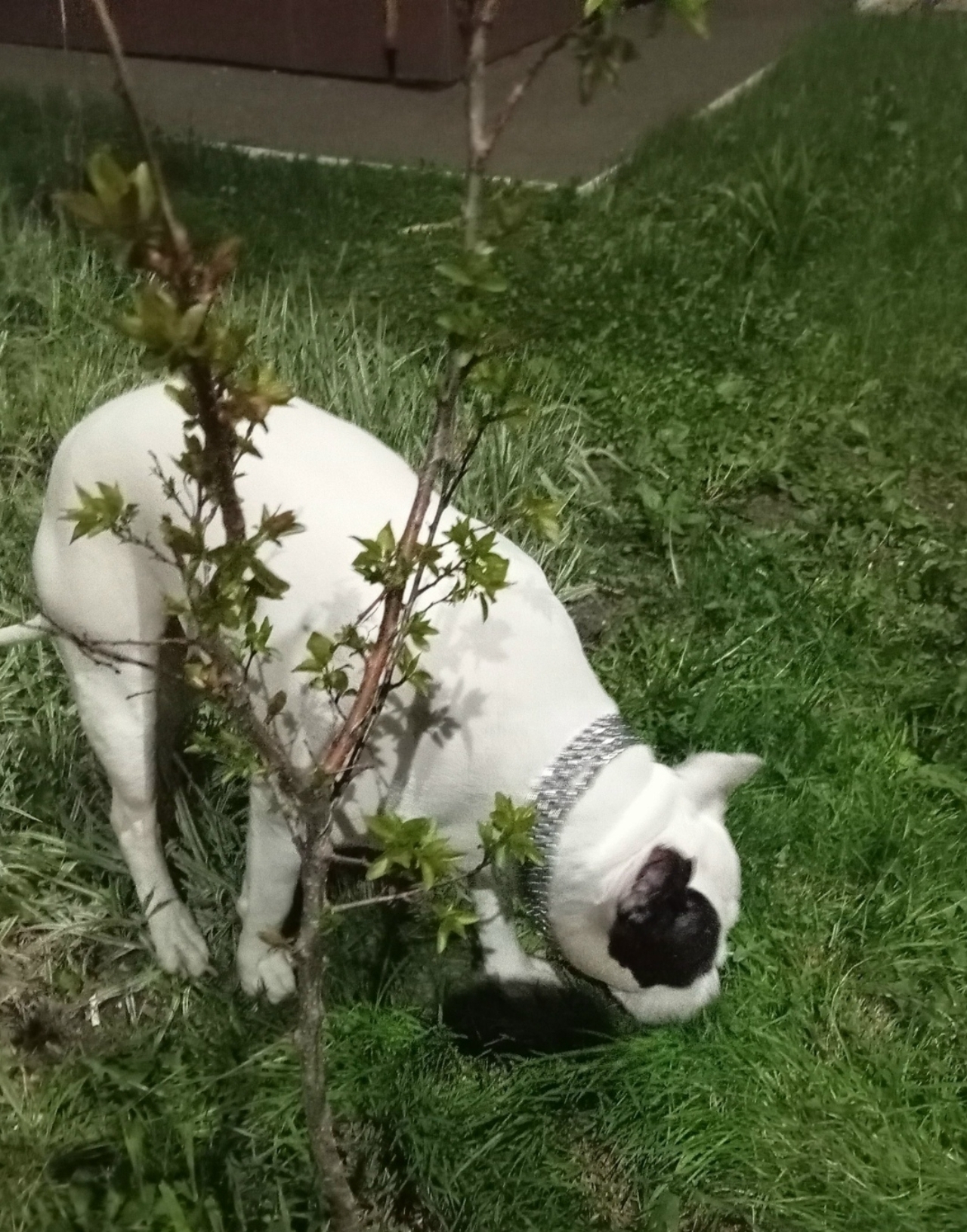 Окрас белый с черными пятнами, большая блестящая цепь, очень дружелюбная собака привязалась и шла до самого подъезда