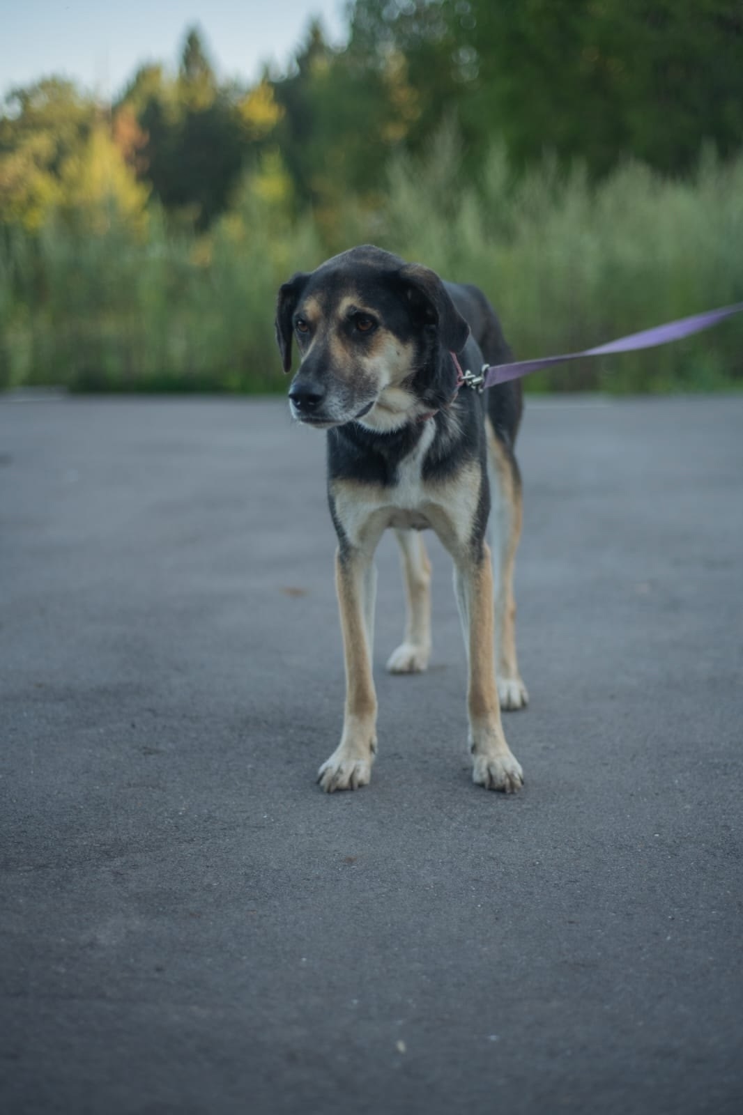 Девочка темно- серая с рыжими и белыми подпалинами, помесь пойнтера. Была в ошейнике.