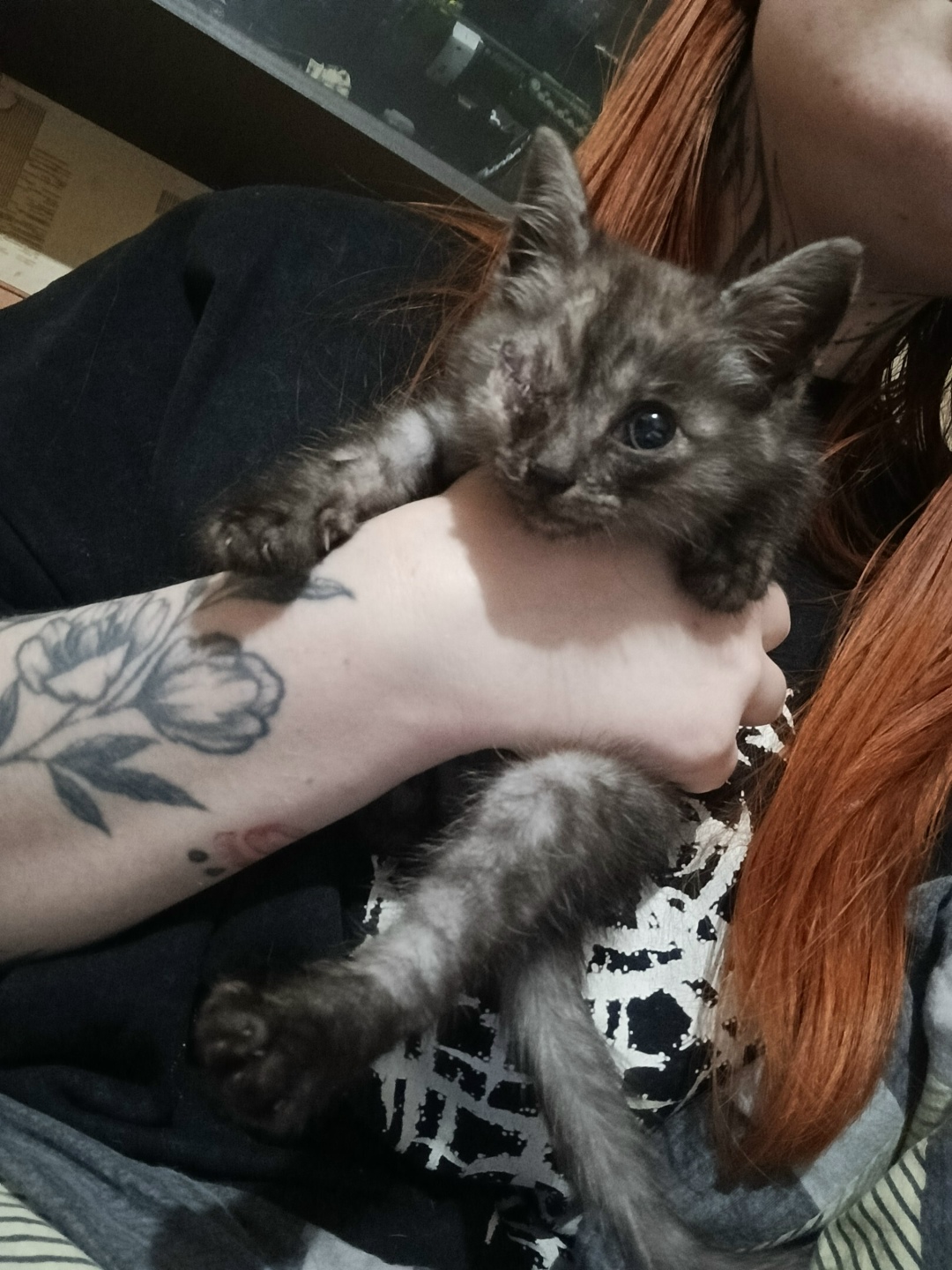 Мы с мужем нашли маленького котенка, который сидел в полном одиночестве на трассе у въезда в городок клин-5. У него был сильно травмирован глаз, поэтому ветеринары экстренно удалили его. Три дня малыш находился под наблюдением специалистов, и теперь он под нашей опекой проходит курс лечения. Мы дали ему имя Кузя.
