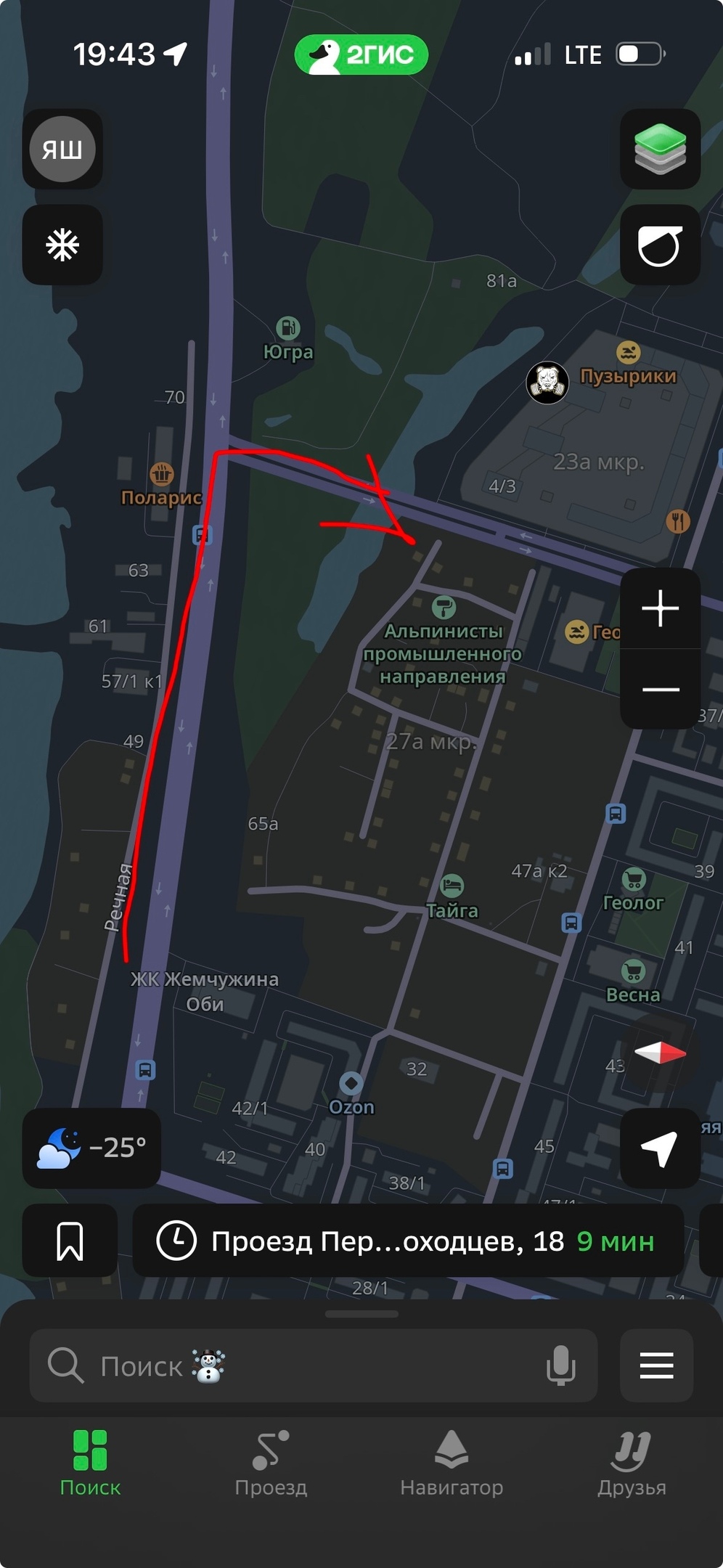 бежит по югорскому тракту вдоль дороги, завернула в сторону Возрождения