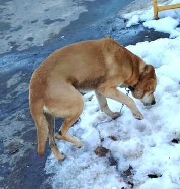 Возле самолёта встретила собаку, кобель, в ошейнике с оборванной цепочкой, напуган, на правую заднюю лапу прихрамывает, лапа кровит.