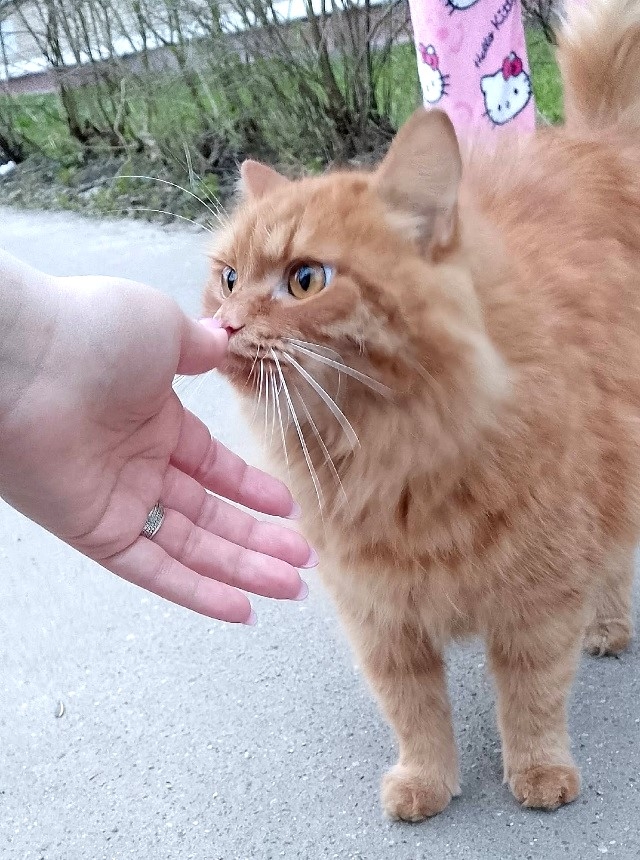 Здравствуйте, на улице в районе Вечного огня появился котик , видно что домашний , сидит не уходит , контактный.