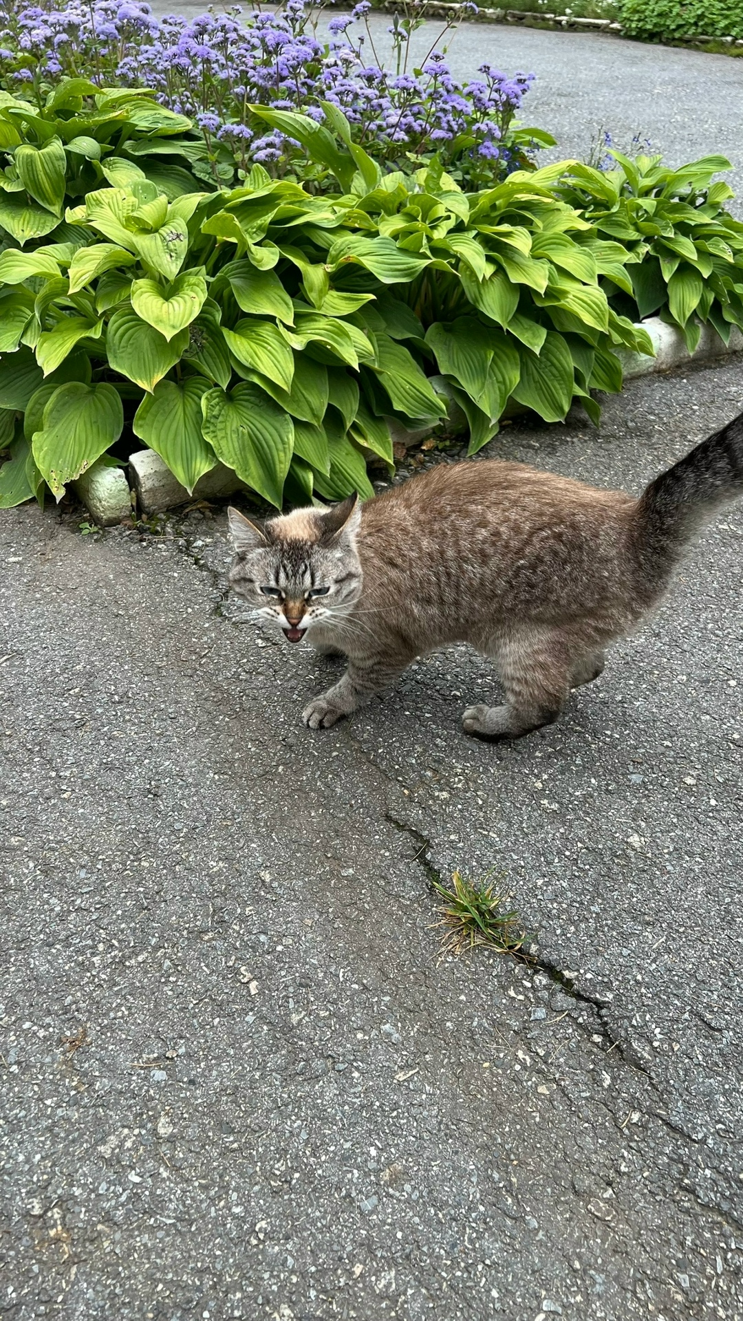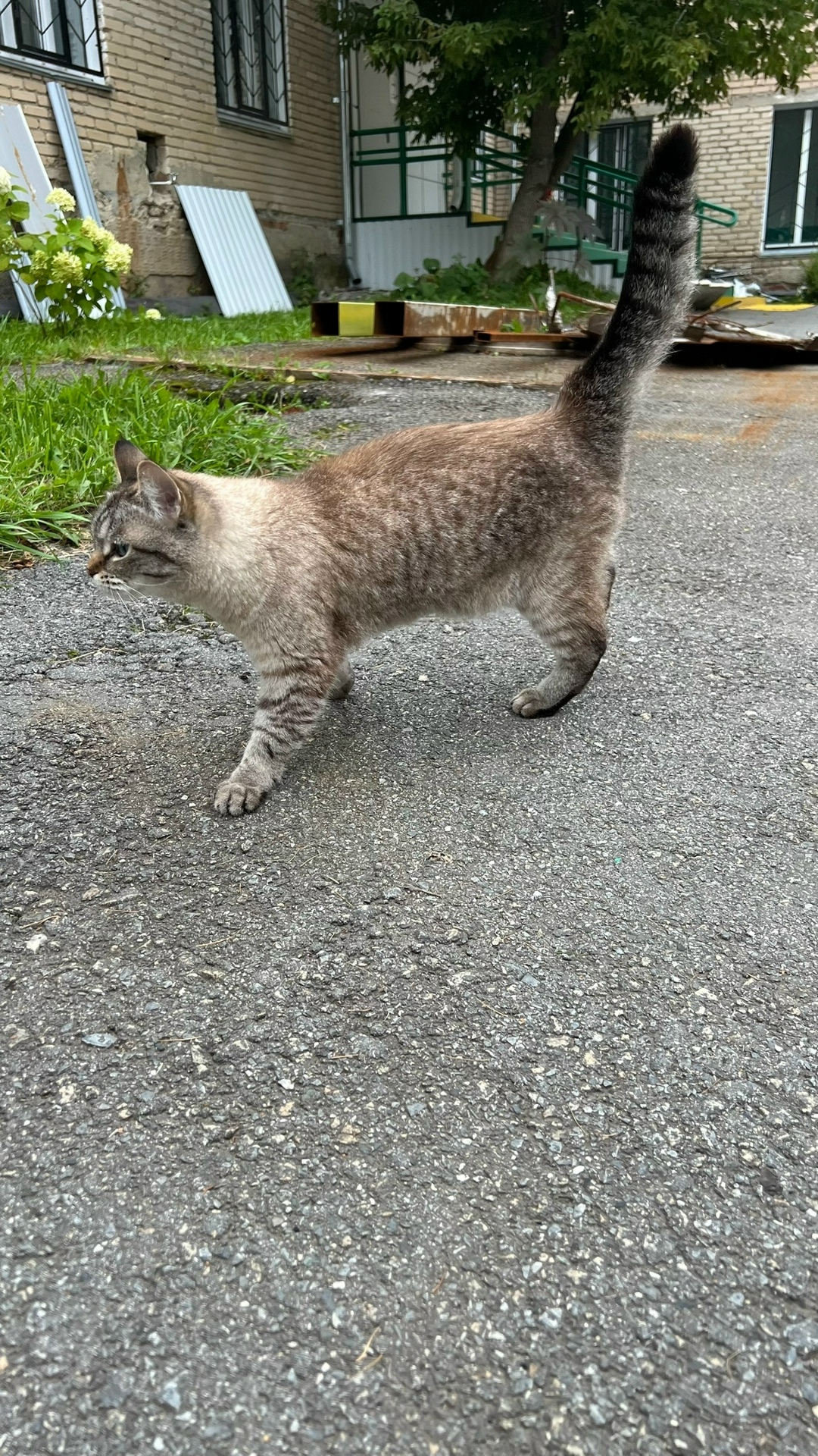 У детской поликлиники на машзавода бегает кошка, рыскает, как будто потерялась. Видно что домашняя, опрятная) на фото кажется что она злая, но она не шипит и не царапает)