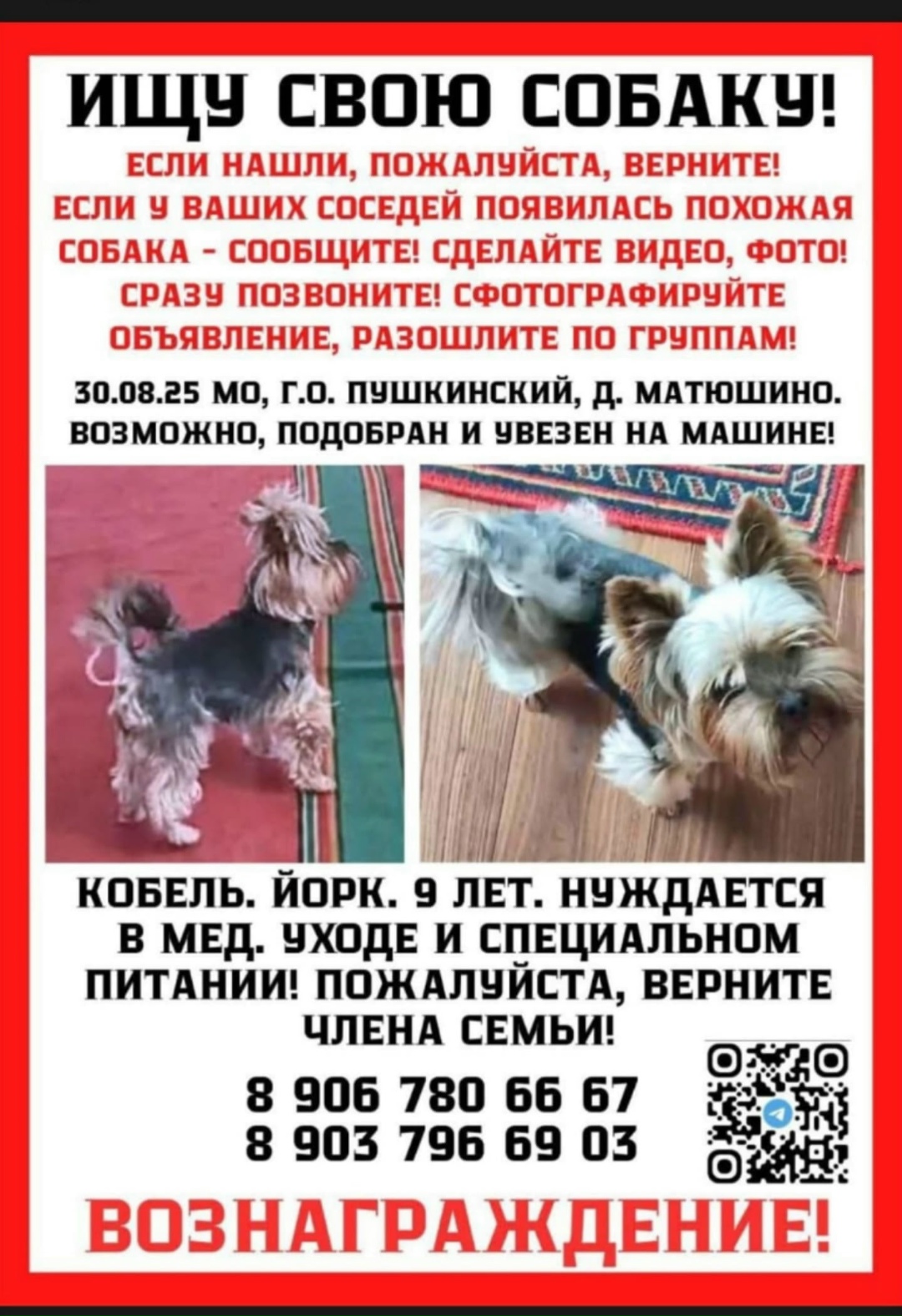 Поиск продрлжается. 30.08 МО Пушкинский р-н д Матюшино пропал Йорк, мальчик, 9 лет, без зубов, нуждается в спец уходе. Был увезен на машине, может оказаться где угодно. У ваших соседей появилась похожая собака, звоните в любое время. Верните ЧУЖУЮ собаку, не дайте ей погибнуть, купим вам СВОЮ молодую, здоровую собаку. Вознаграждение!