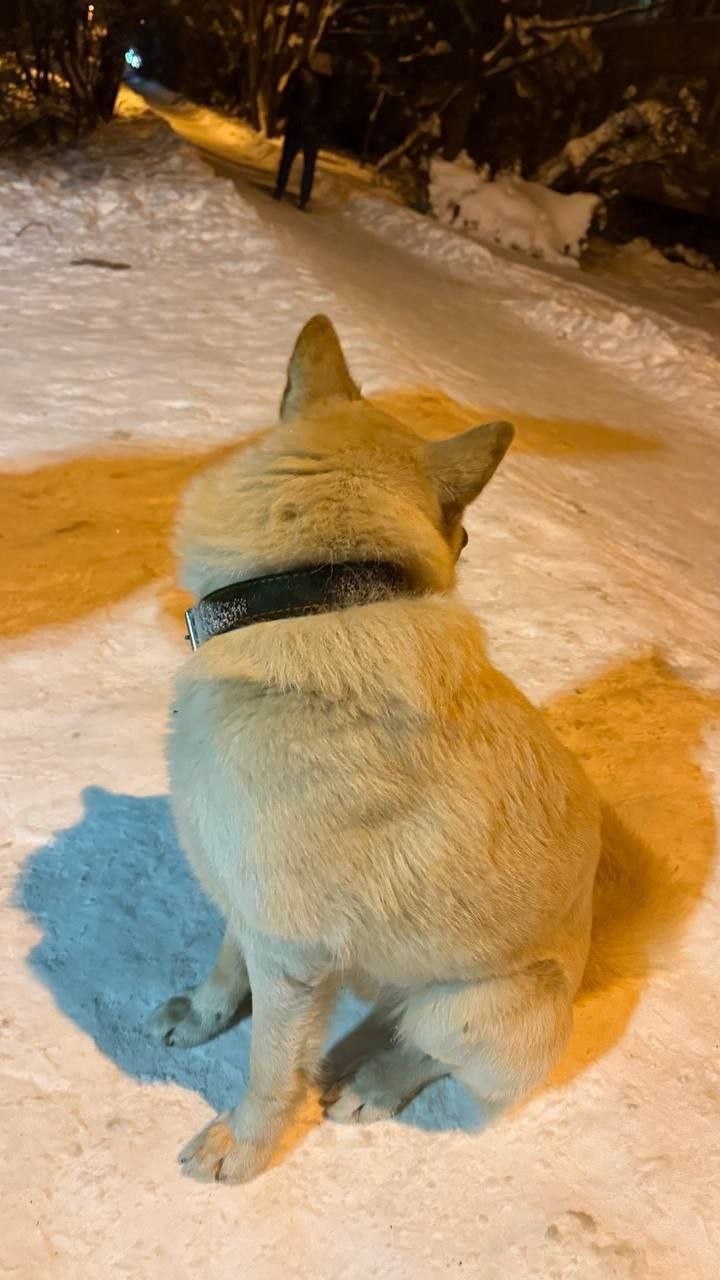 Кобель, в кожаном ошейнике. Палевый окрас, коричневый нос.
