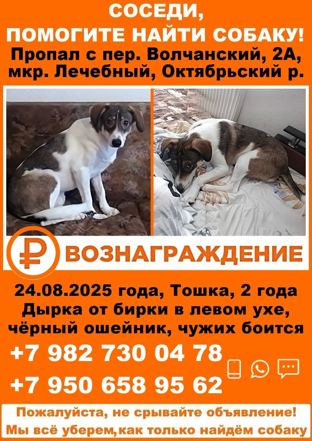 💰 Вознаграждение: гарантирую любому, кто поможет вернуть собаку домой, либо предоставит достоверную информацию о местонахождении, которая поможет вернуть собаку.
