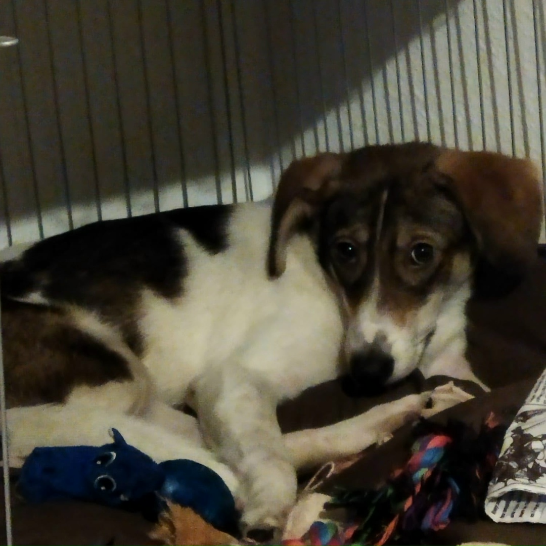 Мальчик, окрас белый с рыжие-коричневым пятнами, уши висят.