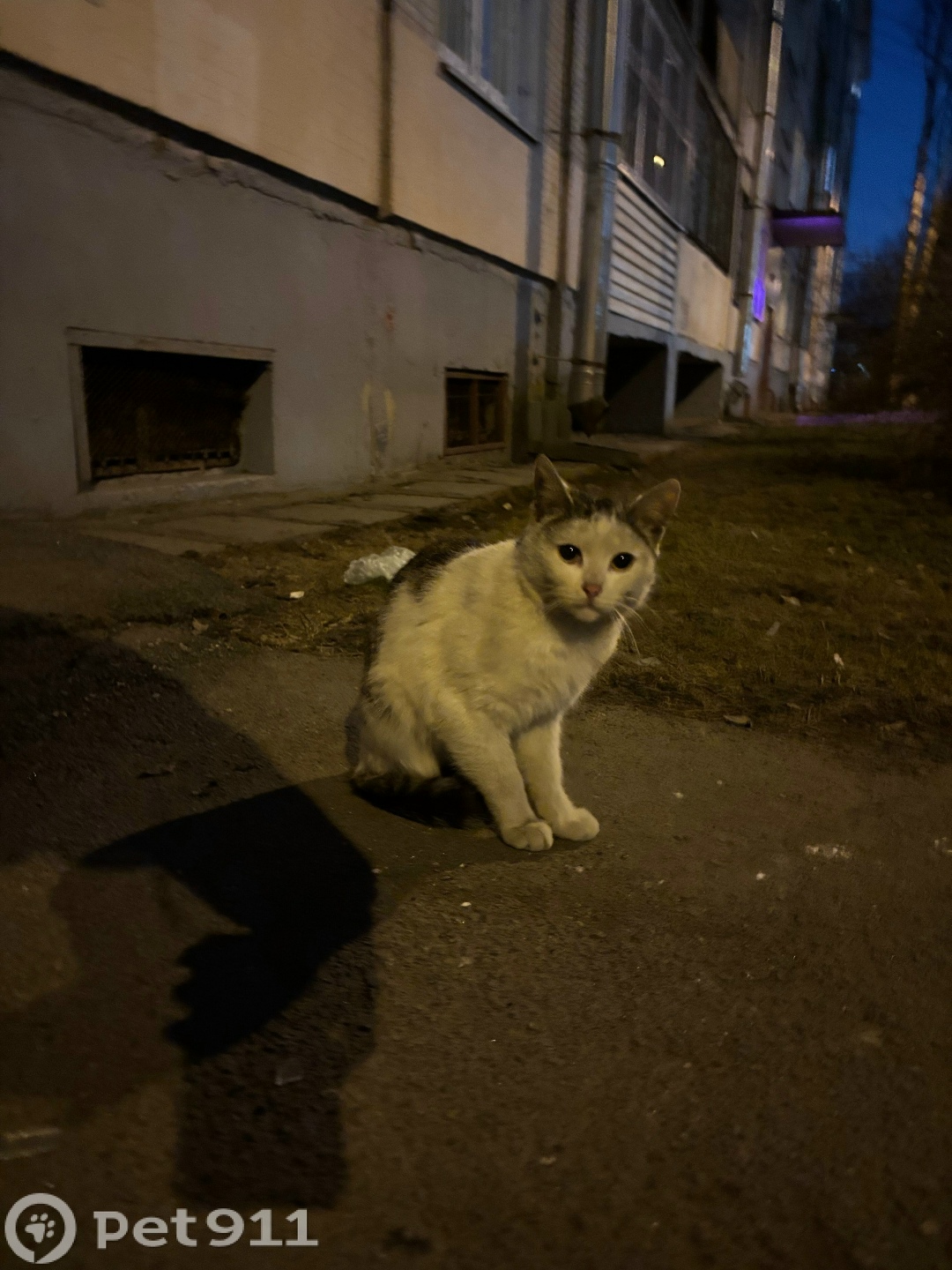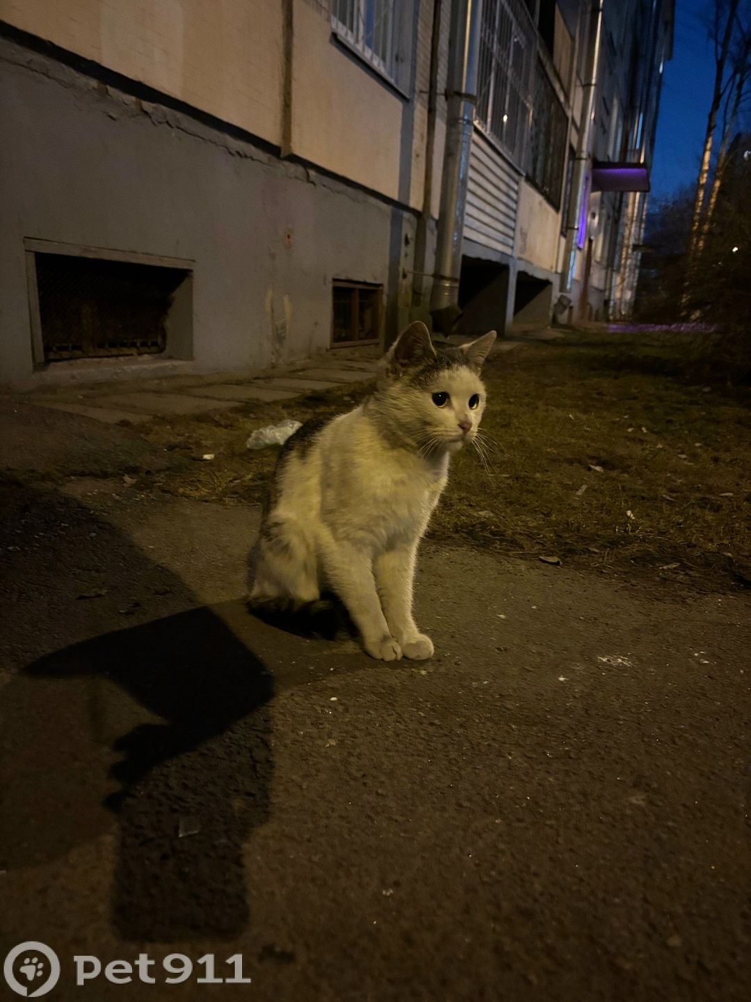Белая, коричневая спинка, хвост и половина головы. Выразительные глаза. Ходила от парадной к парадной. Бежала за мной от двери до машины и обратно. На «кс-кс» отзывалась и подбегала. Но растерянная немного. Возможно чья-то кошка из домов пр. Науки 63, 65, 67, Карпинского 18, 11к1