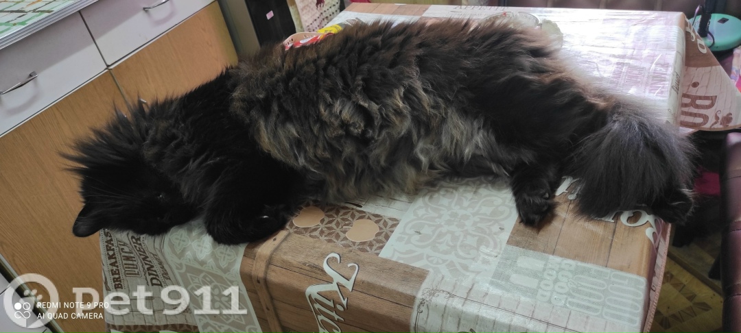 Окрас черный дым. Сам черный брюшко дымчатое. На спине проглядываются редкие сидые шерстинки и на холке. Широкий черный нос. На ушах кистей нету. Ушел гулять на улицу и не вернулся 10 марта. 2026 г.