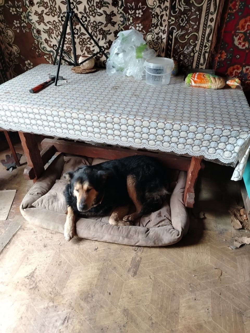 Прибился, с ошейником. Классный, душевный пес