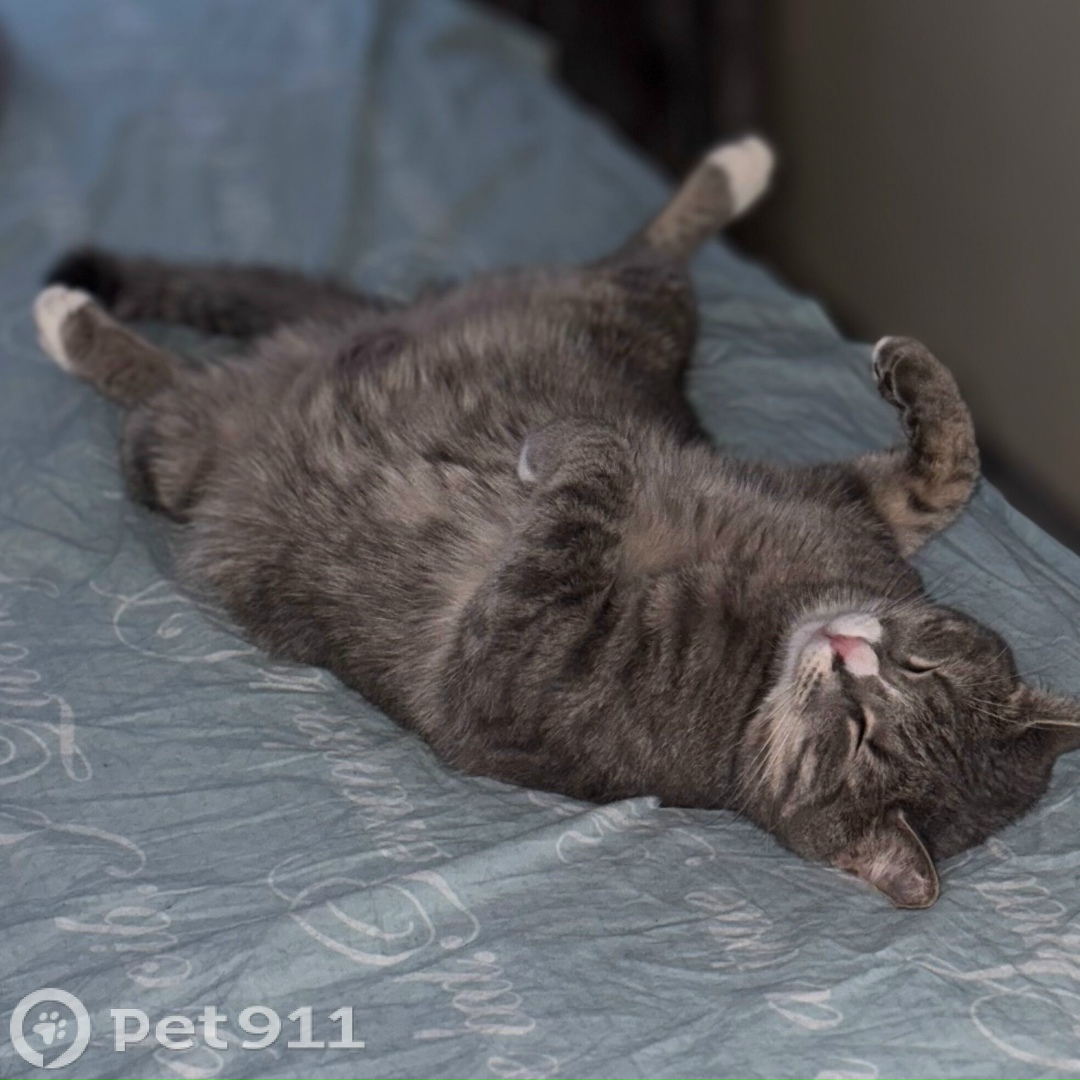 Пропал кот, серый цвет, белые лапки, кроме передней правой, розовый носик Нашедшим позвонить по телефону