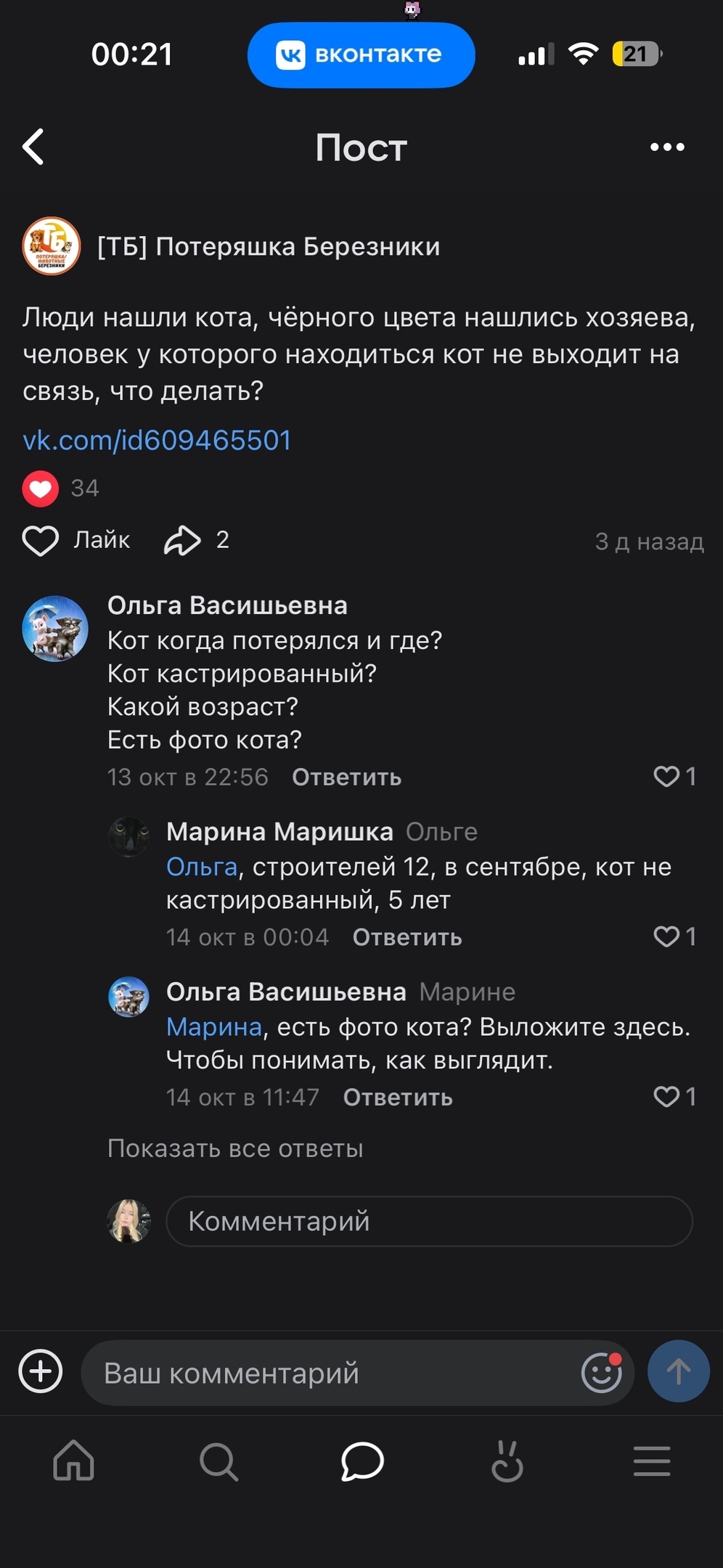 а в следствии чего кидали в игнор, выключили телефоны, если брали трубку, общались очень грубо. Но!! при этом продолжали выкладывать информацию о том, что кота лечат, а отдавать не отдают, хотя хозяйка нашлась и уже выкладывала пост о помощи вернуть кота (второе фото прикрепила)