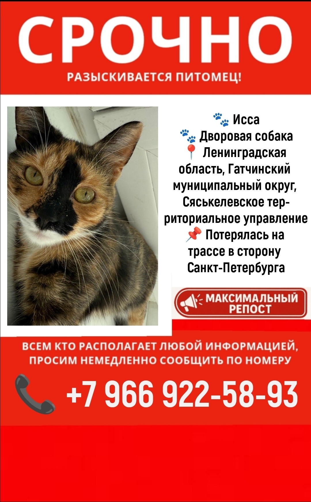 Пропала кошечка! Молодая трёхцветная кошка (черный, белый, коричневый), возраст 1 год и 4 месяца, вес примерно 4-5 кг. Пропала в районе трассы, по дороге с дачи в город. Во время поездки кошечка сходила в туалет, мы остановились почистить переноску, парень держал её, но из-за громких звуков автомобилей кошка испугалась, поцарапала руки и убежала в сторону поля. Искали более часа, оставили возле места исчезновения черную переноску. Кошка откликается на кличку Исса. Если кто-то видел или нашёл кошку, пожалуйста, свяжитесь с нами! Очень переживаем и хотим вернуть её домой.
