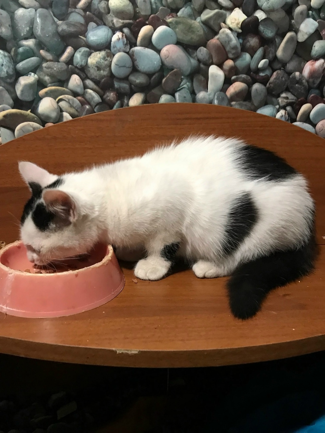 У подъезда мяукал котенок. Очень голодный. То ли потерялся, то ли выкинули. Его временно приютил пожилой человек. Себе оставить не может.