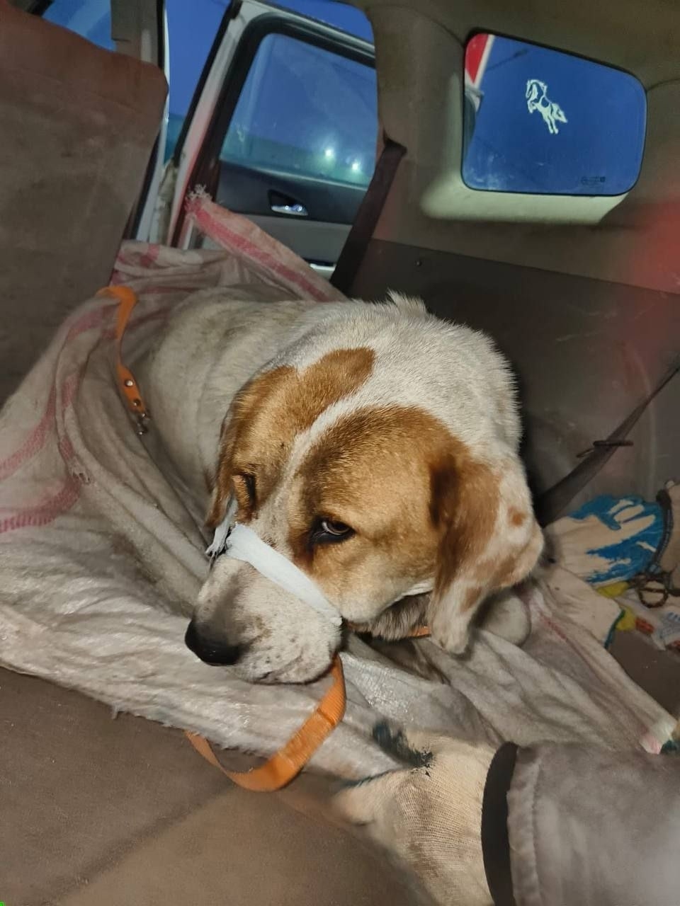 Люди из нашей группы помощи поехали её вызволять.Собаку забрали.Везут в клинику.
