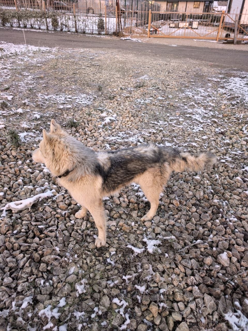 К нашему дому прибился кобель и уже 5-й день не уходит. Изначально не кормили, но вчера всё-таки уже подкормили парня.