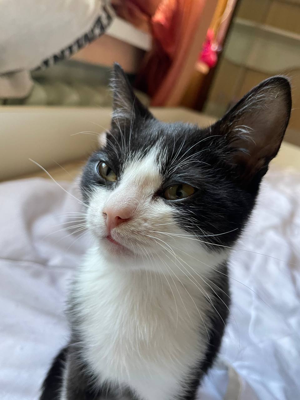 Приметы: черно белый котенок зелено-карие глаза, мальчик, длинные усики, очень ласковый.