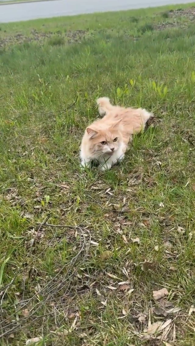 Лежал в траве, не вставал, мяукал.