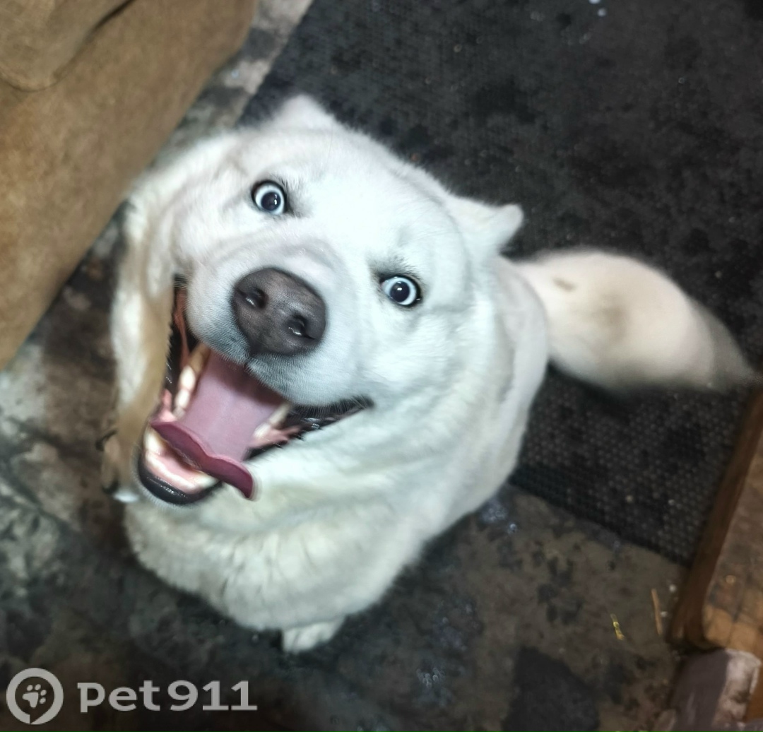 Смесь лайки с хаской,на спине 2 цветных пятна ,одно большое пятно,другое маленькое,сам белый,голубые красивые глаза. Очень добрый