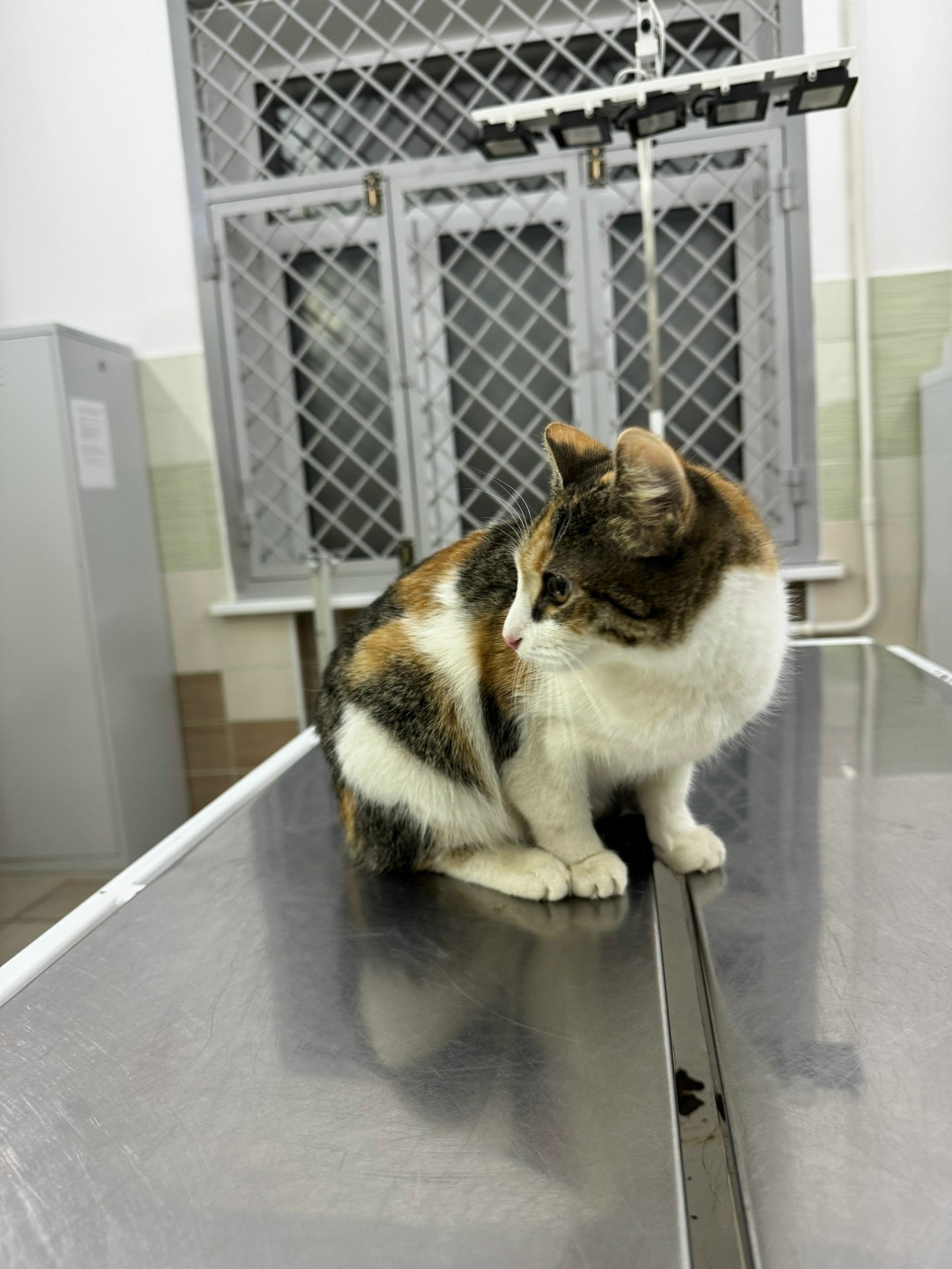на ул. Кирова 17, 2-й подъезд. Жалась в углу на лестничной площадке, никого рядом не было. На вид ориентировочно год, кошка-чистая, видно что домашняя.