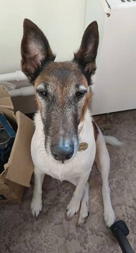 11 тилетняя фокстерьерша, к людям добродушная, общительная. Клеймо на животе. Уши стоят, упитанная.1 фото в молодости.