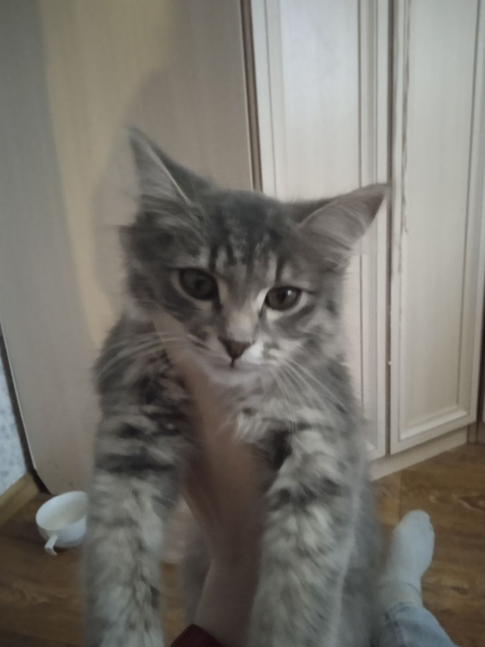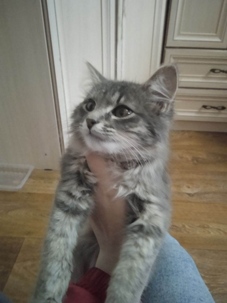 Найден котёнок прямо на проезжей части возле частных домов на конечке пос. Новокашпирский. Чистый, ни единой блошки, пушистый, активный, голодный, на вид месяца 3. Правая передняя лапка возможно была сломана и срослась как-то неправильно, но никак его не беспокоит. Голос у кота какой-то необычный, с хрипотцой. Безумно ласковый, трещащий трактор. Может у кого убежал, потерялся?