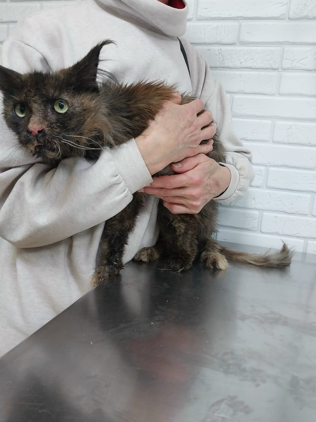 Нашли кошку утром на Пятёрке, сильно истощенная, возможно мейн-кун. Одни косточки 😭