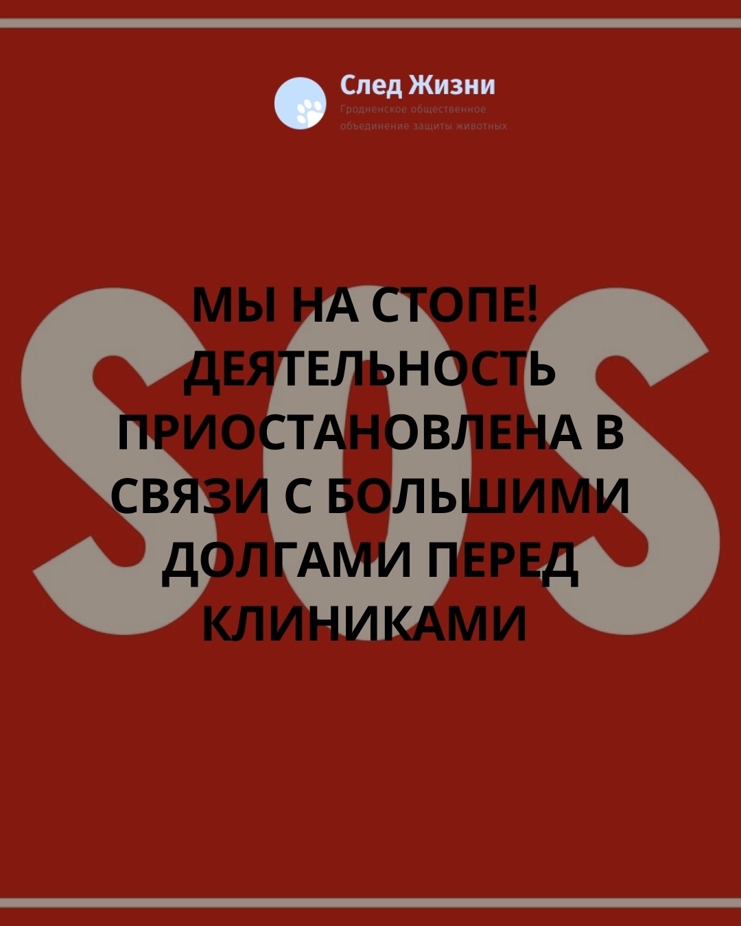 💳ЕРИП на имя "След жизни": ЕРИП => ОБЩЕСТВЕННЫЕ ОБЪЕДИНЕНИЯ => ЗАЩИТА ЖИВОТНЫХ => "СЛЕД ЖИЗНИ, ГООЗЖ", код услуги 232525;