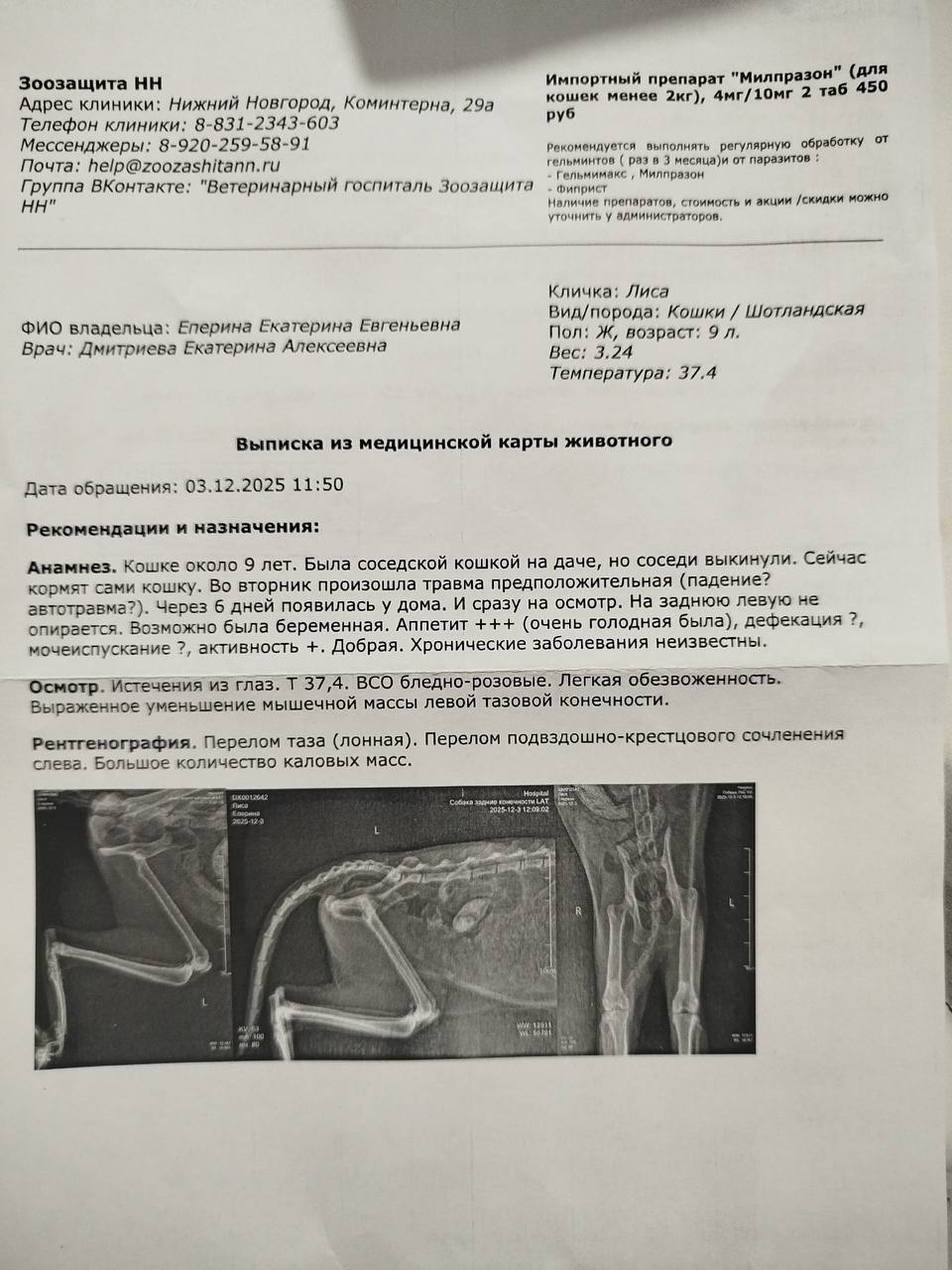 История: Горе соседи по даче выкинули кошку беременную на улицу, когда завели себе поруду Мейкун. Кошка прибилась к нам и на протяжение 2-х лет, мы семьей ее кормим. Одного котенка пришлось забрать домой. Но вот пришло горе(( 24.11 когда мама приехала домой, то увидела, что кошка храмает, не успела ее поймать. До сегодняшнего дня кошка не приходила😞 Мы ее ежедневно искали. Сегодня утром мне позвонили и сказали, что она пришла истощенная, голодная и на лапку не встает. Я приняла решение и сразу отвезла ее в Нижний в Зоозащиту. Там нам сделали рентген и принял травмотолог., купили обезболивающее. Прогнозы не утишительны, предположительно сбил автомобиль и у кошки перелом таза (донная) и перелом подвздошной костив на левой лапе. Требуется срочная операция и предоперационное обследование, умоляю помогите🙏🏻🙏🏻🙏🏻