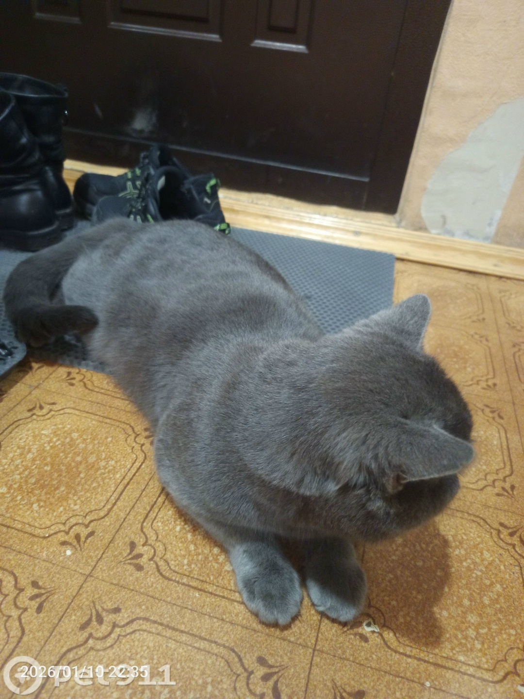 Бегал около подъезда, потом зашëл, видно что домашний