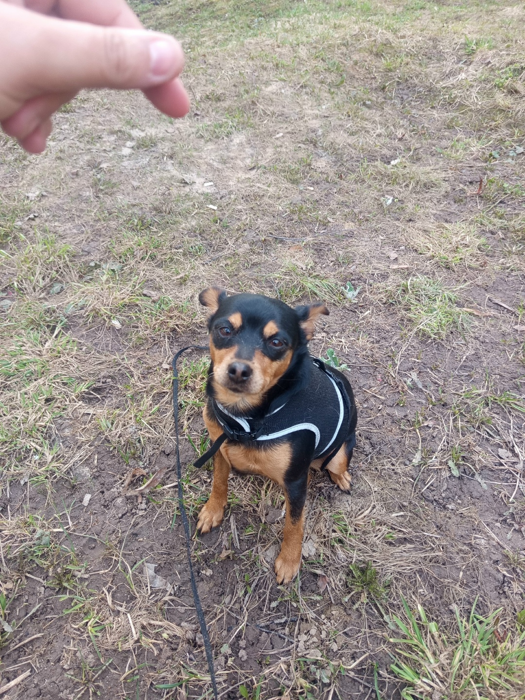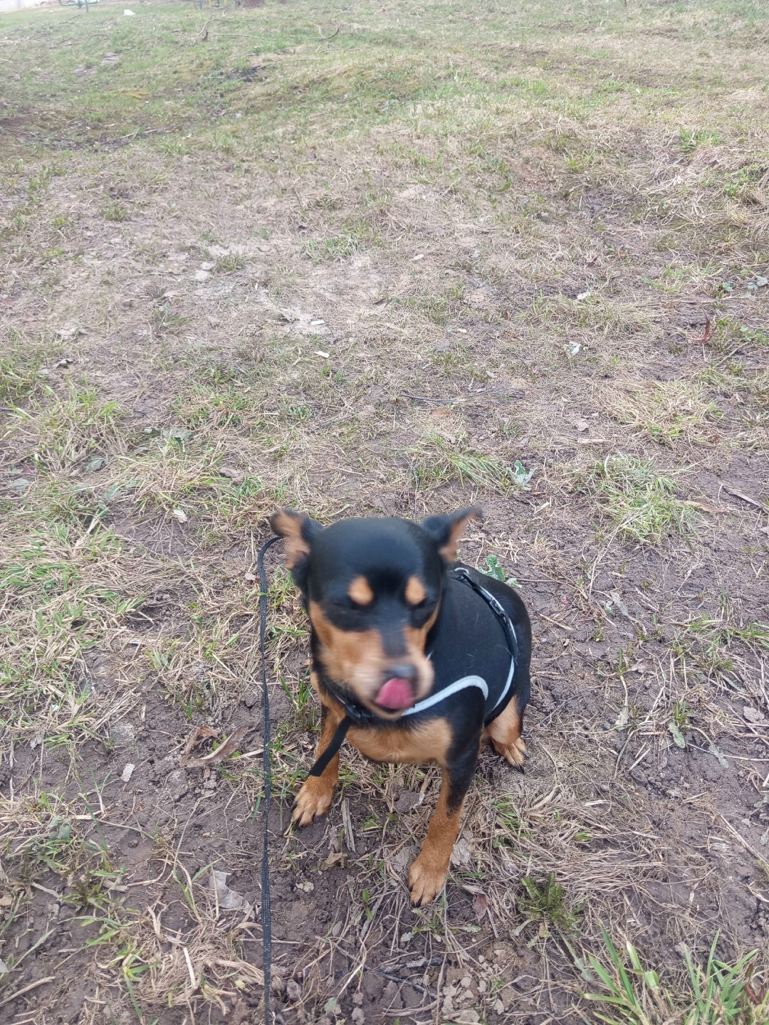 Сегодня я нашла на дороге между Крапивной и Одоевом (чуть не попала под машину) Девочка, маленькая, похожа на той терьера, крысарика, цвергпинчер. Видно потеряшка. Сама в машину села. С кошками хорошо ладит.