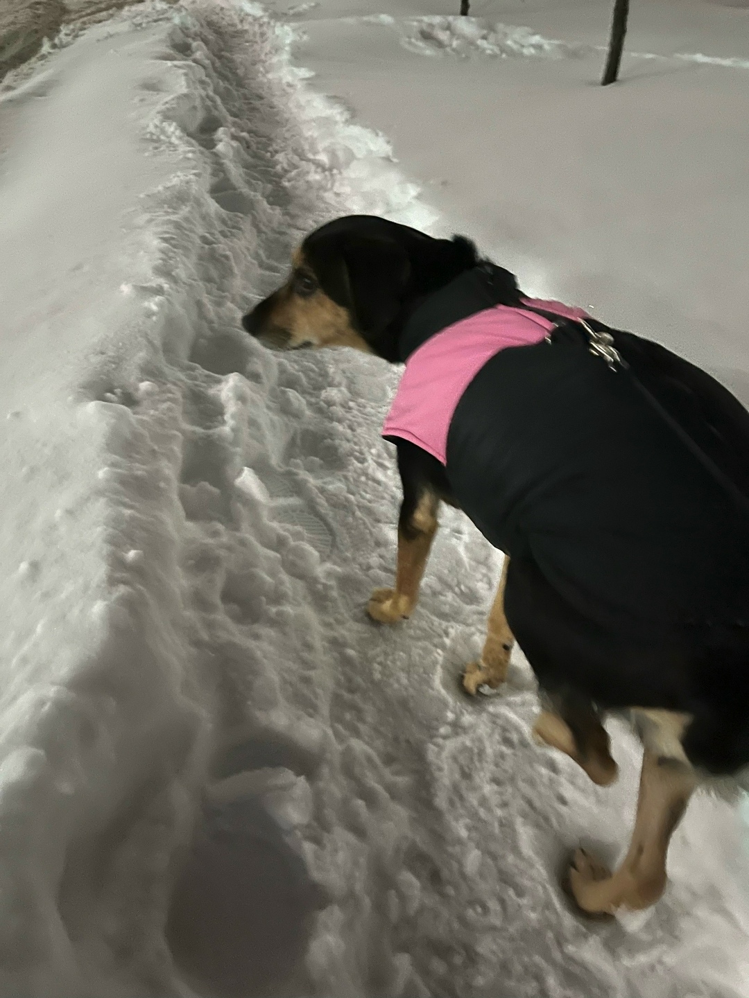 Нашли собаку в 5 мкр, Романа Брянского. В розовом комбезе девочка. На ночь взяли на передержку.