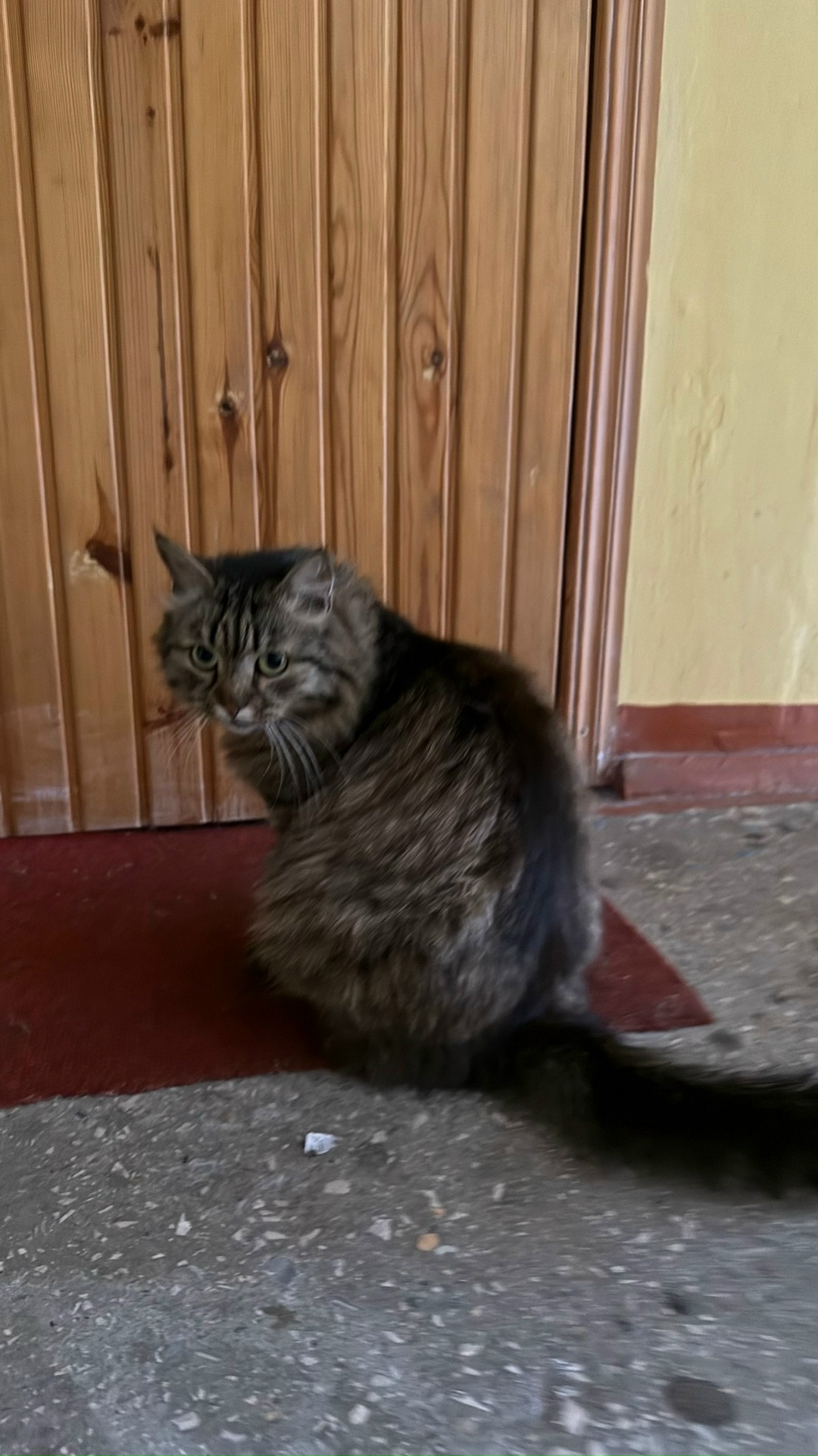 Прибился котик серо-коричневый, пушистый, к квартирному дому по улице Авиационный переулок 3/2.