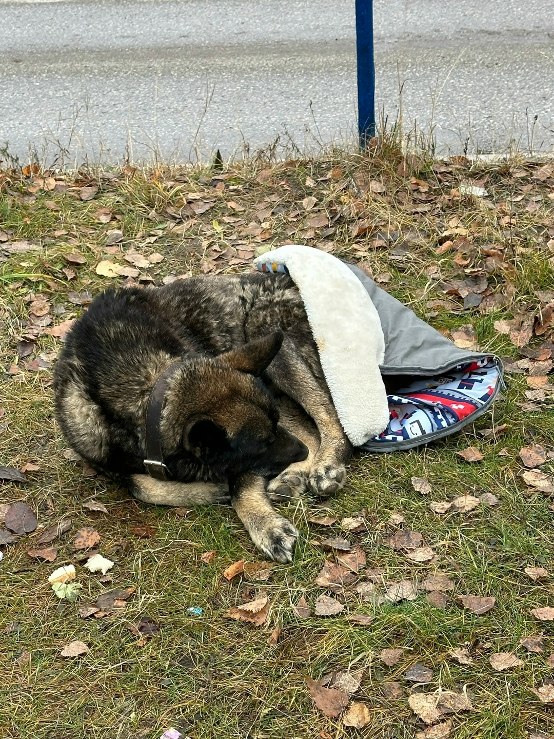 Собака - крупный беспородный кобель, напоминающий лайку. Лежала в воскресенье 9 ноября во дворе дома №81 по ул.Тентюковской.